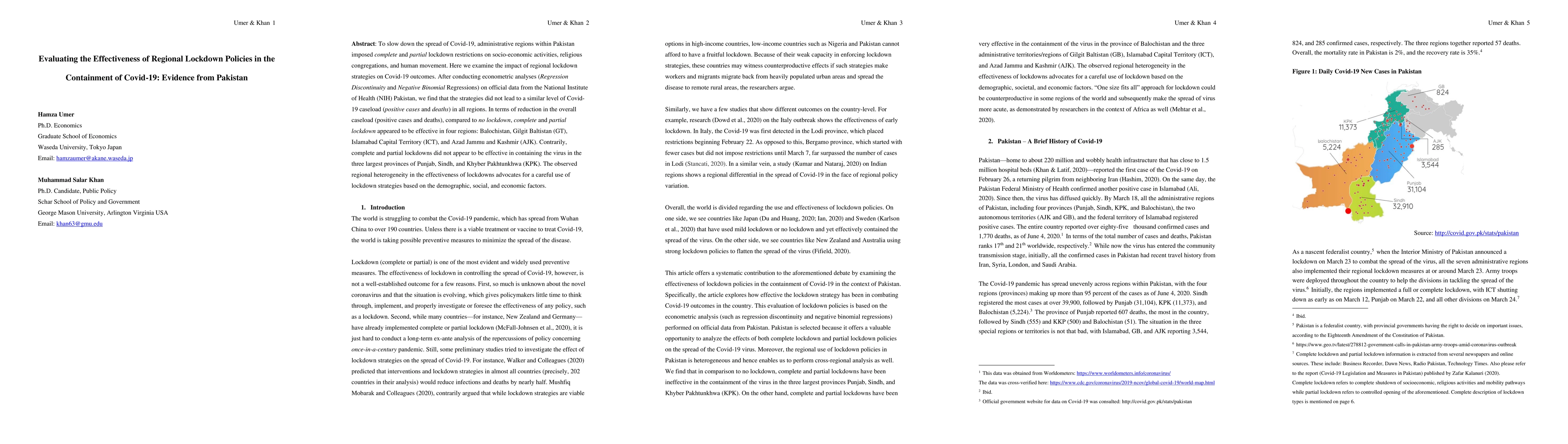 This paper evaluates the impact of regional lockdown policies in Pakistan on Covid-19 containment, finding mixed results across different regions. While lockdowns were effective in reducing cases in Balochistan, GT, ICT, and AJK, they did not yield similar results in Punjab, Sindh, and KPK, highlighting the need for tailored lockdown strategies.