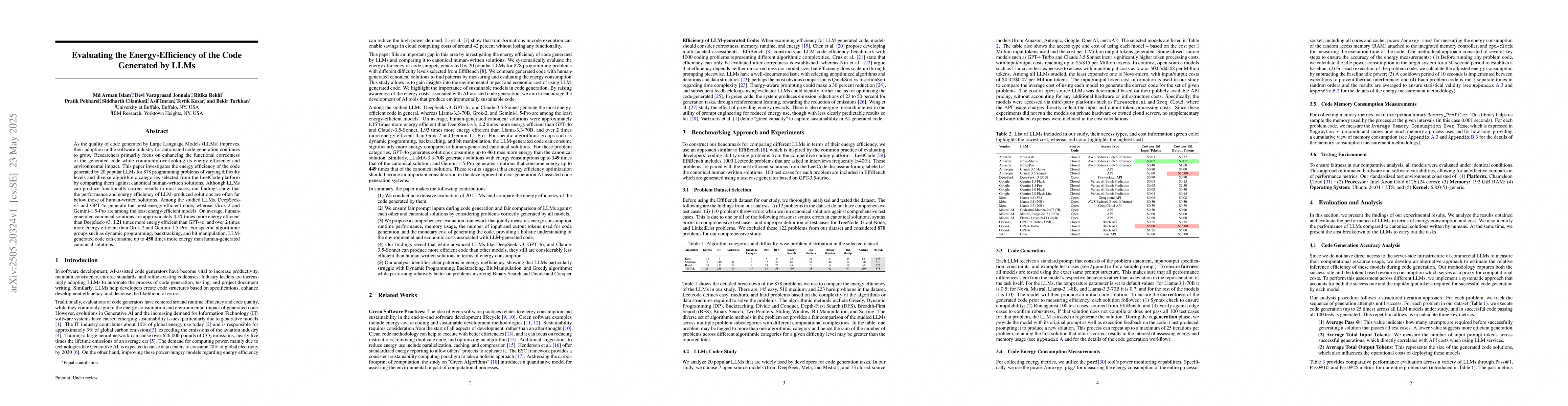 The paper compares the energy efficiency of code generated by 20 popular LLMs against canonical human-written solutions for 878 programming problems from LeetCode, across varying difficulty levels and algorithmic categories.