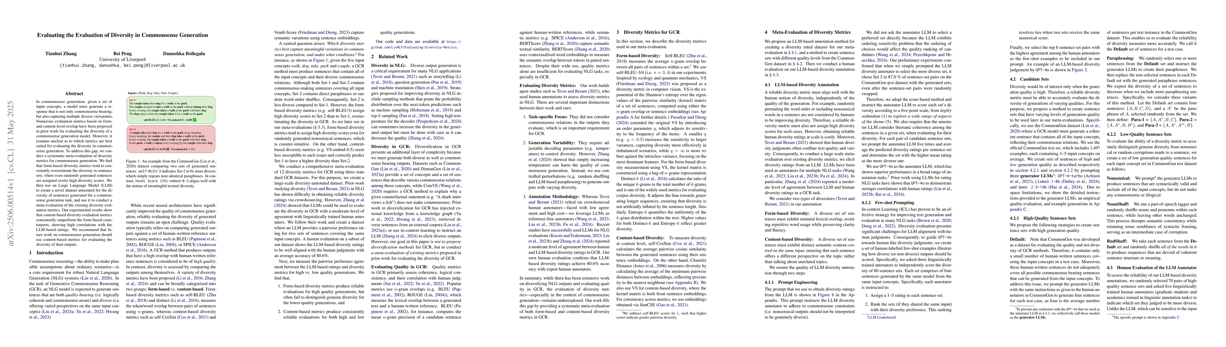 This research conducts a meta-evaluation of diversity metrics for commonsense generation, comparing form-based and content-based metrics using multiple datasets and generator language models.
