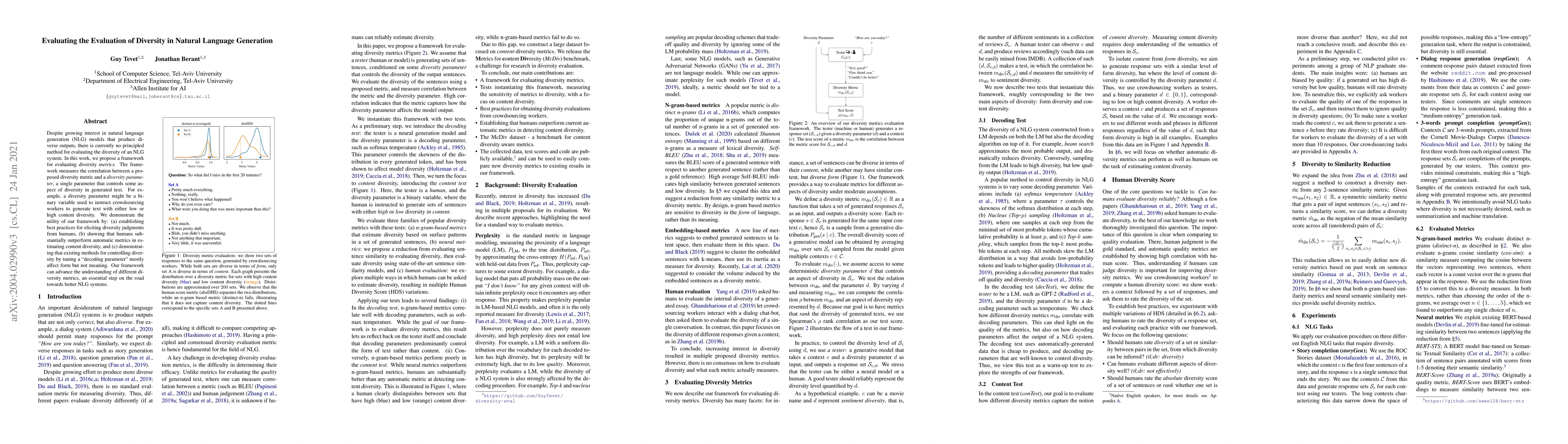 This paper proposes a framework to evaluate diversity in natural language generation (NLG) models, measuring the correlation between proposed diversity metrics and a diversity parameter. The authors demonstrate that humans outperform automatic metrics in estimating content diversity and show that existing methods primarily affect form rather than meaning.