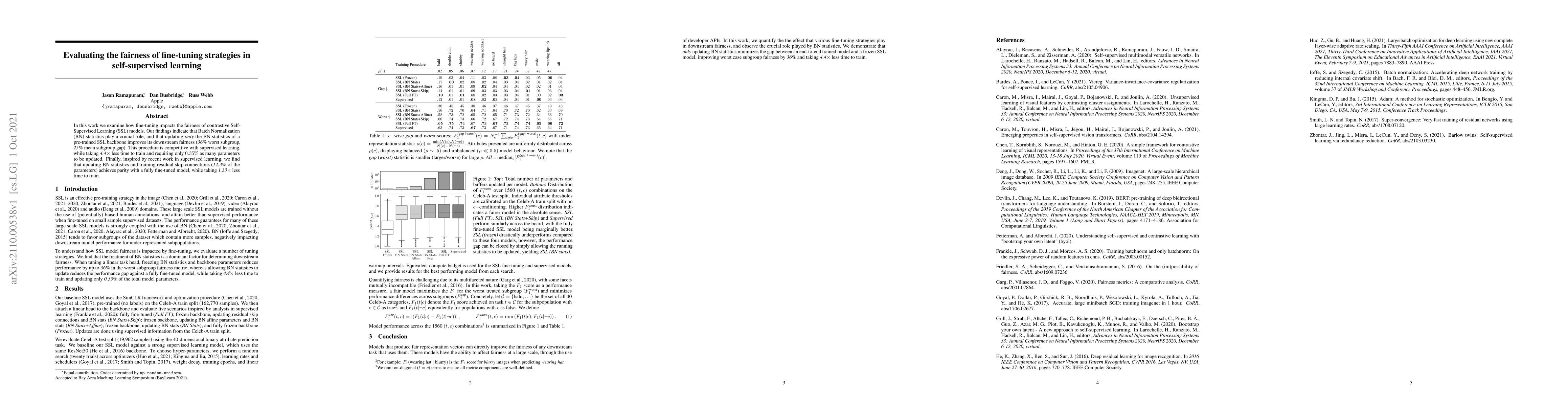 In this work we examine how fine-tuning impacts the fairness of contrastive Self-Supervised Learning (SSL) models. Our findings indicate that Batch Normalization (BN) statistics play a crucial role, and that updating only the BN statistics of a pre-trained SSL backbone improves its downstream fairness (36% worst subgroup, 25% mean subgroup gap). This procedure is competitive with supervised learning, while taking 4.4x less time to train and requiring only 0.35% as many parameters to be updated. Finally, inspired by recent work in supervised learning, we find that updating BN statistics and training residual skip connections (12.3% of the parameters) achieves parity with a fully fine-tuned model, while taking 1.33x less time to train.