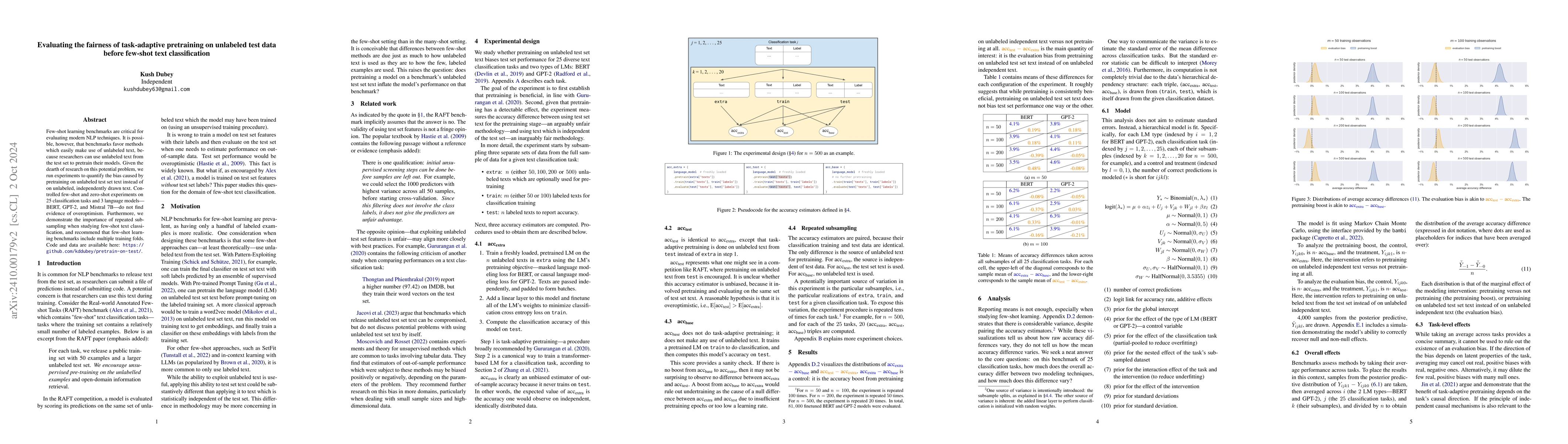 This study investigates the fairness of pretraining NLP models on unlabeled test data for few-shot text classification, finding no evidence of bias when compared to pretraining on independent unlabeled text. It emphasizes the importance of repeated subsampling in few-shot learning experiments and recommends benchmarks include multiple training folds.