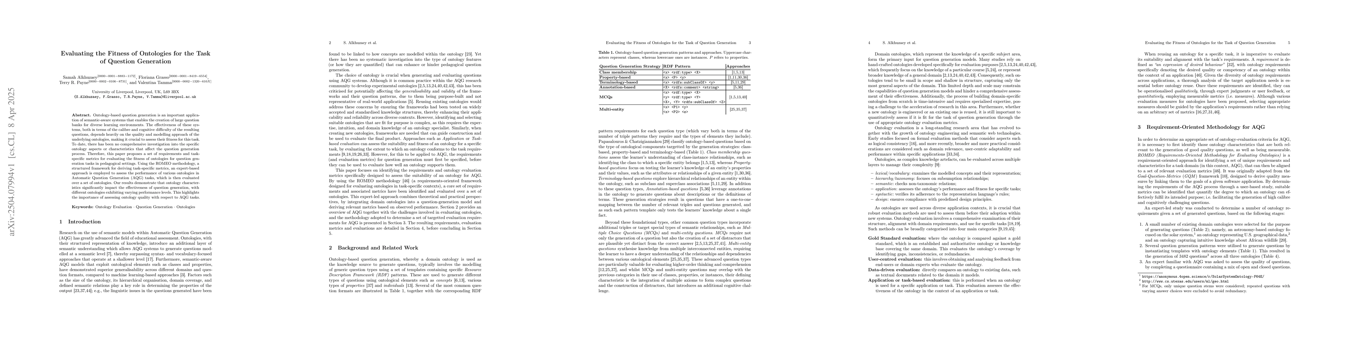 The paper proposes a set of requirements and task-specific metrics for evaluating the fitness of ontologies for question generation tasks in pedagogical settings.