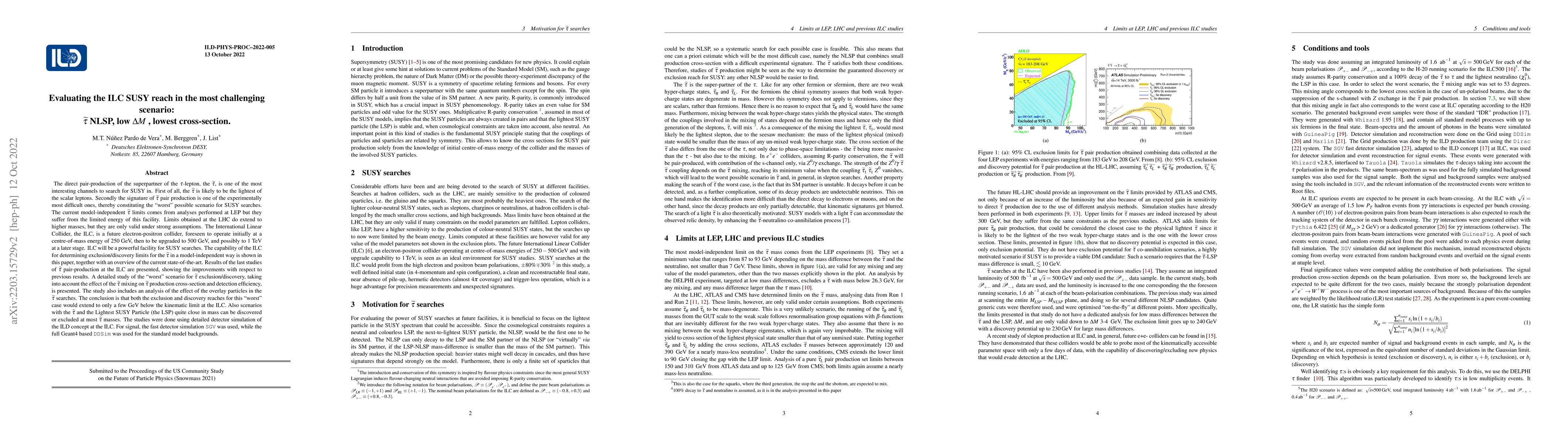 This paper evaluates the International Linear Collider's (ILC) capability to detect or exclude the superpartner of the tau lepton ($\tilde{\tau}$) in the most challenging scenario, where $\tilde{\tau}$ is the next-to-lightest supersymmetric particle (NLSP), with low mass differences and low production cross-section. The study concludes that the ILC's reach in this "worst" case scenario is limited to a few GeV below the kinematic limit.