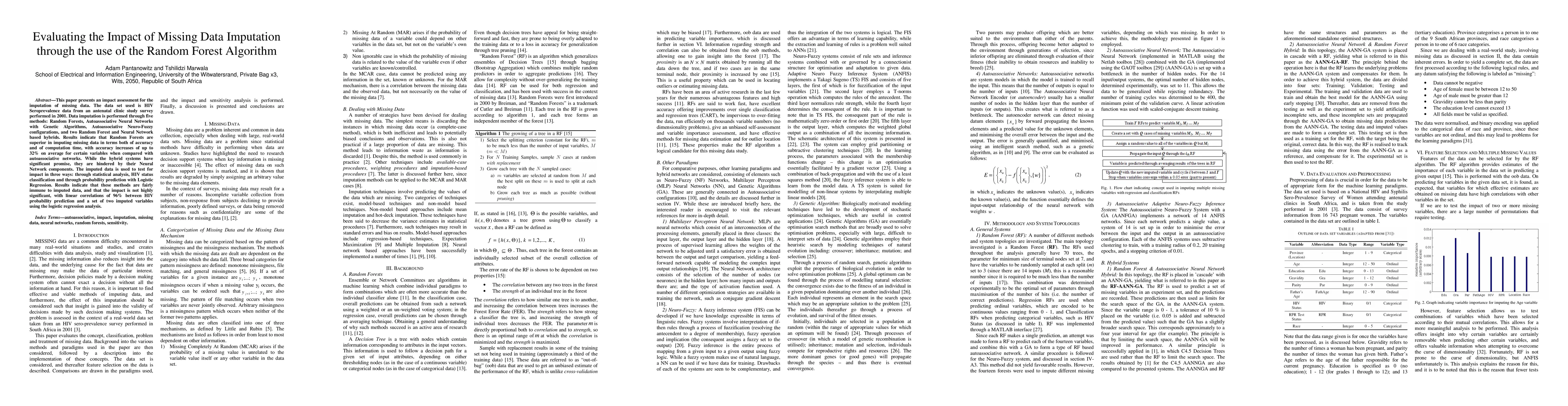 This paper presents an impact assessment for the imputation of missing data. The data set used is HIV Seroprevalence data from an antenatal clinic study survey performed in 2001. Data imputation is performed through five methods: Random Forests, Autoassociative Neural Networks with Genetic Algorithms, Autoassociative Neuro-Fuzzy configurations, and two Random Forest and Neural Network based hybrids. Results indicate that Random Forests are superior in imputing missing data in terms both of accuracy and of computation time, with accuracy increases of up to 32% on average for certain variables when compared with autoassociative networks. While the hybrid systems have significant promise, they are hindered by their Neural Network components. The imputed data is used to test for impact in three ways: through statistical analysis, HIV status classification and through probability prediction with Logistic Regression. Results indicate that these methods are fairly immune to imputed data, and that the impact is not highly significant, with linear correlations of 96% between HIV probability prediction and a set of two imputed variables using the logistic regression analysis.
