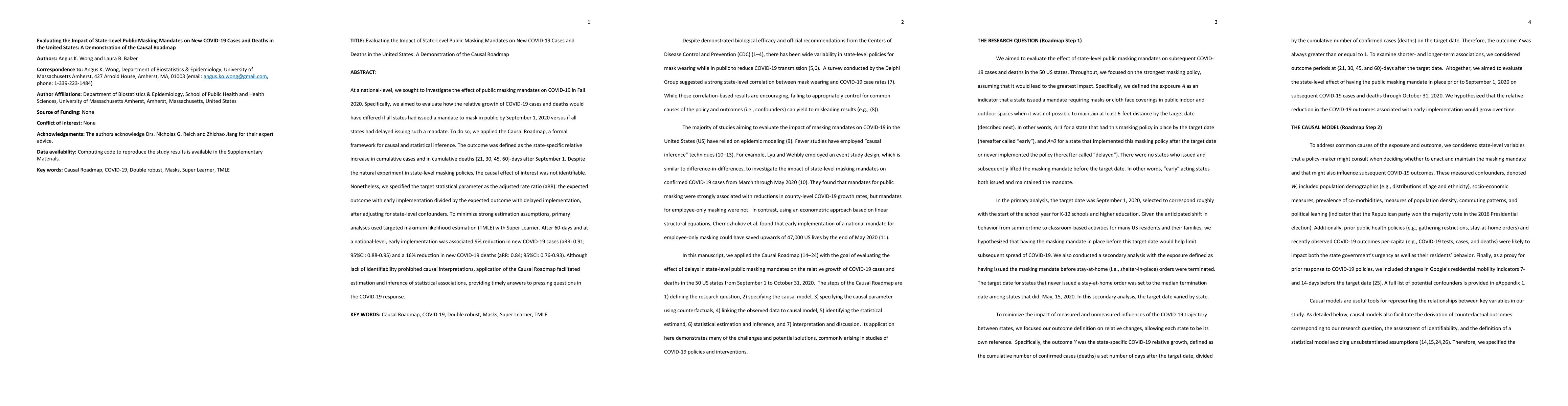 This study applied the Causal Roadmap to assess the impact of early state-level public masking mandates on COVID-19 cases and deaths in the U.S. in Fall 2020, finding a 9% reduction in cases and a 16% reduction in deaths after 60 days, though causal effects were not identifiable.