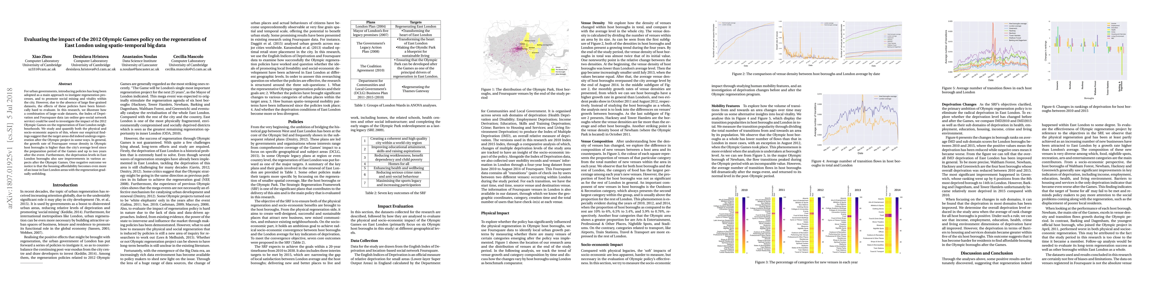 For urban governments, introducing policies has long been adopted as a main approach to instigate regeneration processes, and to promote social mixing and vitality within the city. However, due to the absence of large fine-grained datasets, the effects of these policies have been historically hard to evaluate. In this research, we illustrate how a combination of large-scale datasets, the Index of Deprivation and Foursquare data (an online geo-social network service) could be used to investigate the impact of the 2012 Olympic Games on the regeneration of East London neighbourhoods. We study and quantify both the physical and socio-economic aspects of this, where our empirical findings suggest that the target areas did indeed undergo regeneration after the Olympic project in some ways. In general, the growth rate of Foursquare venue density in Olympic host boroughs is higher than the city's average level since the preparation period of the Games and up to two years after the event. Furthermore, the deprivation levels in East London boroughs also saw improvements in various aspects after the Olympic Games. One negative outcome we notice is that the housing affordability becomes even more of an issue in East London areas with the regeneration gradually unfolding.