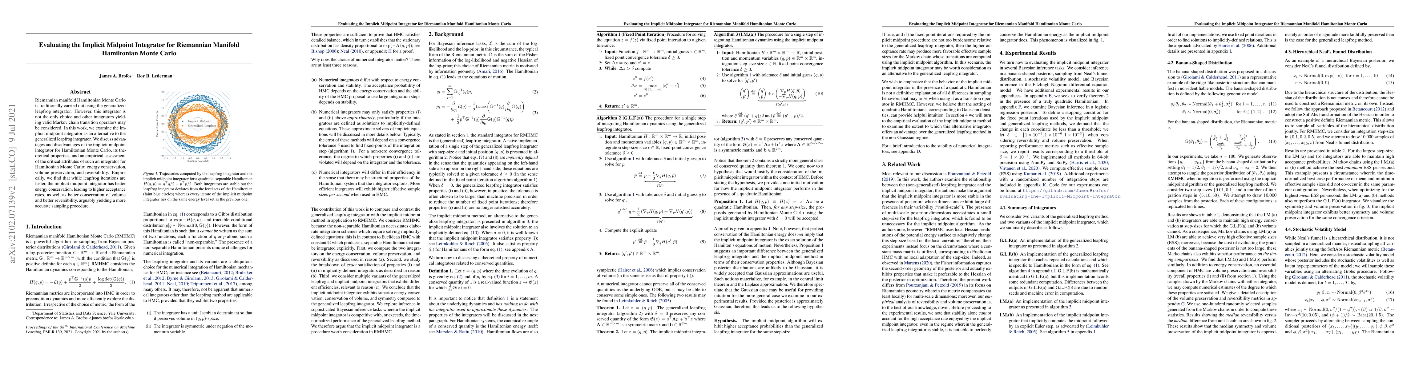 This paper explores the implicit midpoint integrator as an alternative to the generalized leapfrog integrator for Riemannian manifold Hamiltonian Monte Carlo. While the leapfrog method is faster, the implicit midpoint integrator shows superior energy conservation, volume preservation, and reversibility, potentially leading to more accurate sampling.