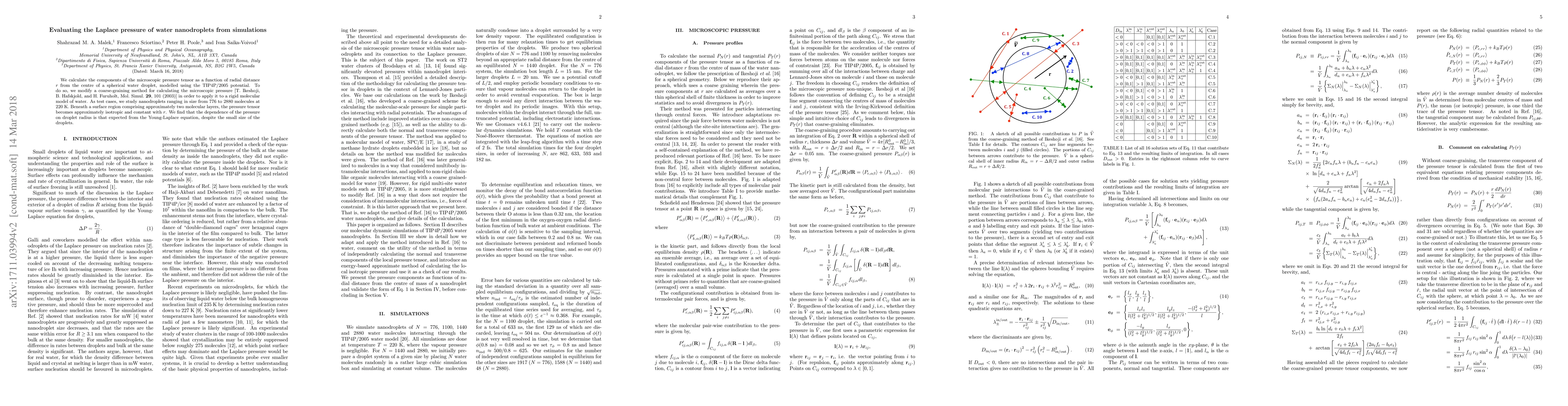 We calculate the components of the microscopic pressure tensor as a function of radial distance r from the centre of a spherical water droplet, modelled using the TIP4P/2005 potential. To do so, we modify a coarse-graining method for calculating the microscopic pressure [T. Ikeshoji, B. Hafskjold, and H. Furuholt, Mol. Simul. 29, 101 (2003)] in order to apply it to a rigid molecular model of water. As test cases, we study nanodroplets ranging in size from 776 to 2880 molecules at 220 K. Beneath a surface region comprising approximately two molecular layers, the pressure tensor becomes approximately isotropic and constant with r. We find that the dependence of the pressure on droplet radius is that expected from the Young-Laplace equation, despite the small size of the droplets.