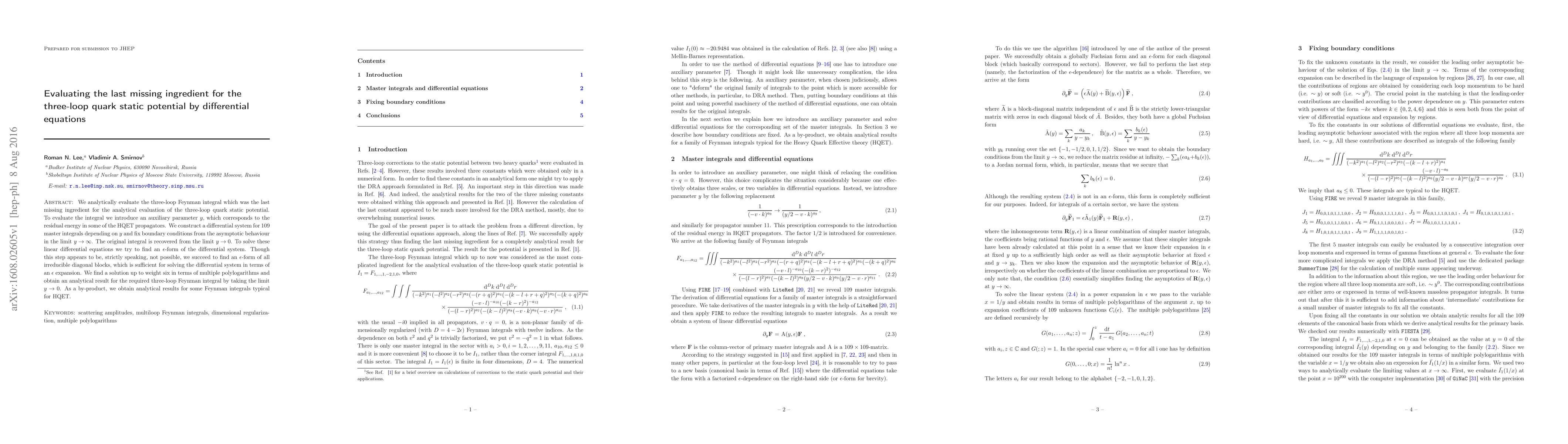 We analytically evaluate the three-loop Feynman integral which was the last missing ingredient for the analytical evaluation of the three-loop quark static potential. To evaluate the integral we introduce an auxiliary parameter $y$, which corresponds to the residual energy in some of the HQET propagators. We construct a differential system for 109 master integrals depending on $y$ and fix boundary conditions from the asymptotic behaviour in the limit $y\to \infty$. The original integral is recovered from the limit $y\to 0$. To solve these linear differential equations we try to find an $\epsilon$-form of the differential system. Though this step appears to be, strictly speaking, not possible, we succeed to find an $\epsilon$-form of all irreducible diagonal blocks, which is sufficient for solving the differential system in terms of an $\epsilon$ expansion. We find a solution up to weight six in terms of multiple polylogarithms and obtain an analytical result for the required three-loop Feynman integral by taking the limit $y\to 0$. As a by-product, we obtain analytical results for some Feynman integrals typical for HQET.