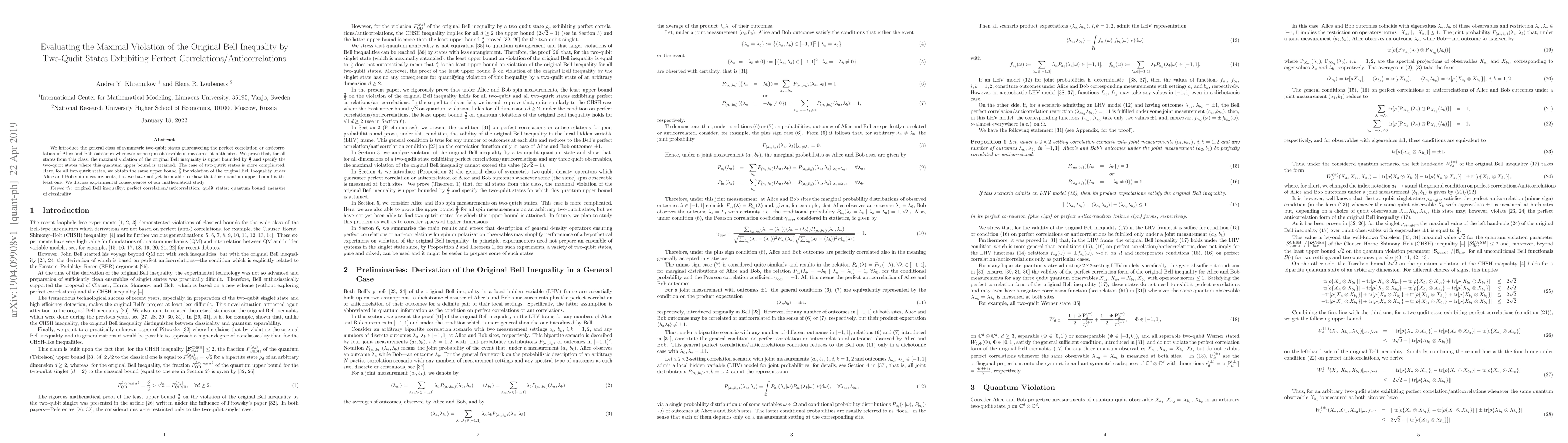This paper investigates symmetric two-qubit and two-qutrit states that exhibit perfect correlations or anticorrelations. It finds that the maximal violation of the original Bell inequality for these states is upper bounded by 3/2, with specific two-qubit states achieving this limit. For two-qutrit states, the same upper bound is observed, but it is not yet confirmed if it is the least possible. The study also considers experimental implications.