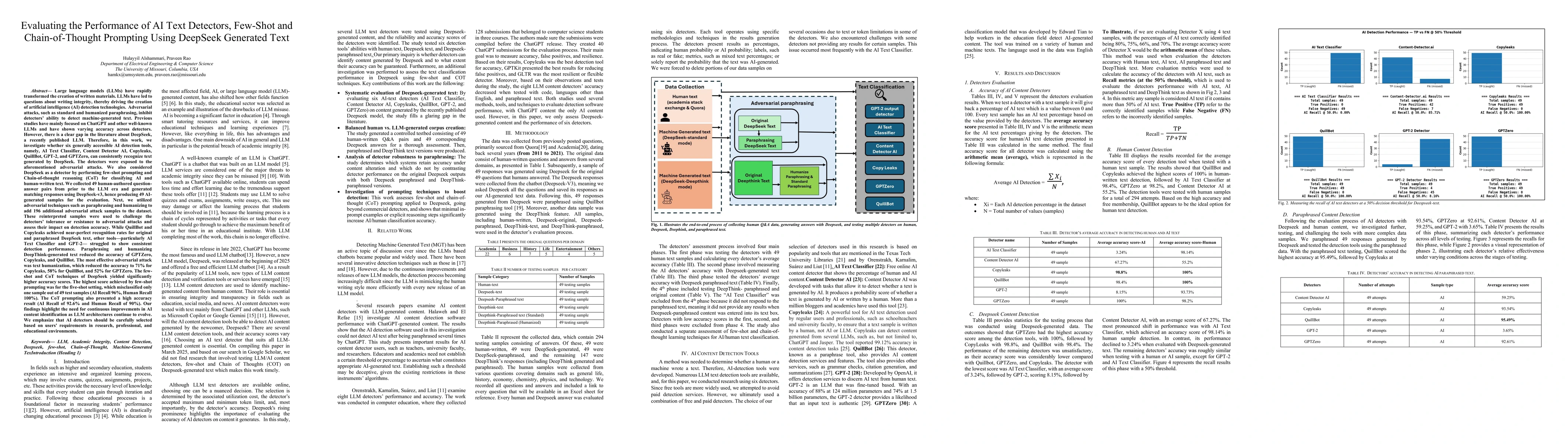 Large language models (LLMs) have rapidly transformed the creation of written materials. LLMs have led to questions about writing integrity, thereby driving the creation of artificial intelligence (AI) detection technologies. Adversarial attacks, such as standard and humanized paraphrasing, inhibit detectors' ability to detect machine-generated text. Previous studies have mainly focused on ChatGPT and other well-known LLMs and have shown varying accuracy across detectors. However, there is a clear gap in the literature about DeepSeek, a recently published LLM. Therefore, in this work, we investigate whether six generally accessible AI detection tools -- AI Text Classifier, Content Detector AI, Copyleaks, QuillBot, GPT-2, and GPTZero -- can consistently recognize text generated by DeepSeek. The detectors were exposed to the aforementioned adversarial attacks. We also considered DeepSeek as a detector by performing few-shot prompting and chain-of-thought reasoning (CoT) for classifying AI and human-written text. We collected 49 human-authored question-answer pairs from before the LLM era and generated matching responses using DeepSeek-v3, producing 49 AI-generated samples. Then, we applied adversarial techniques such as paraphrasing and humanizing to add 196 more samples. These were used to challenge detector robustness and assess accuracy impact. While QuillBot and Copyleaks showed near-perfect performance on original and paraphrased DeepSeek text, others -- particularly AI Text Classifier and GPT-2 -- showed inconsistent results. The most effective attack was humanization, reducing accuracy to 71% for Copyleaks, 58% for QuillBot, and 52% for GPTZero. Few-shot and CoT prompting showed high accuracy, with the best five-shot result misclassifying only one of 49 samples (AI recall 96%, human recall 100%).