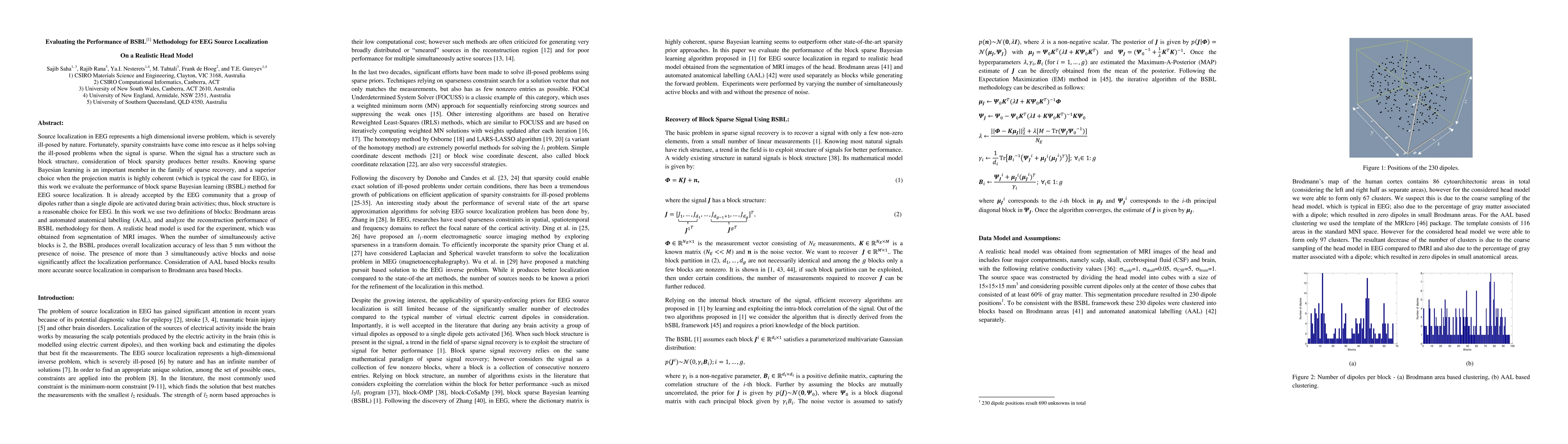 This paper evaluates the block sparse Bayesian learning (BSBL) methodology for EEG source localization using a realistic head model derived from MRI segmentation. BSBL shows high accuracy (<5 mm) for localizing 2 active blocks without noise, but performance degrades with more active blocks and noise, with AAL-based blocks yielding more accurate localization than Brodmann area-based blocks.