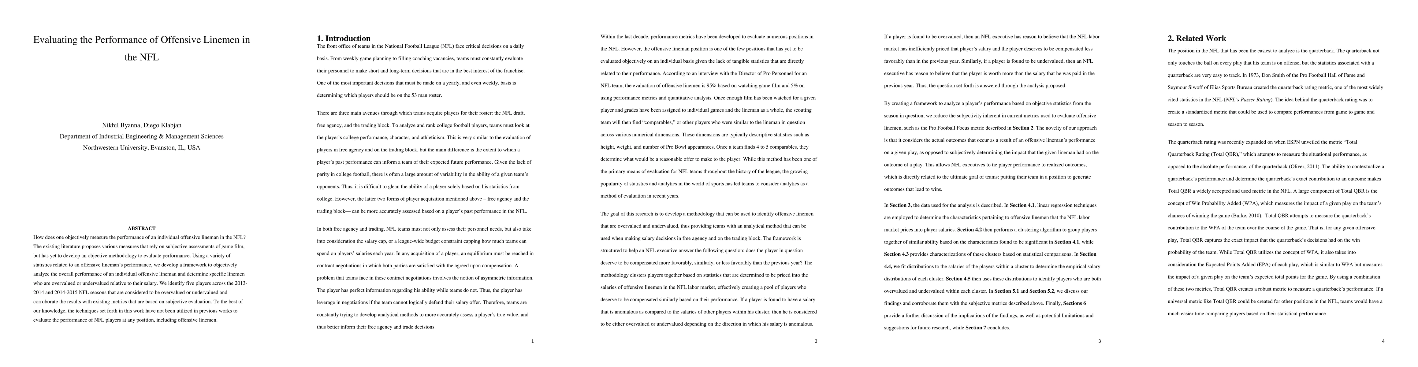 How does one objectively measure the performance of an individual offensive lineman in the NFL? The existing literature proposes various measures that rely on subjective assessments of game film, but has yet to develop an objective methodology to evaluate performance. Using a variety of statistics related to an offensive lineman's performance, we develop a framework to objectively analyze the overall performance of an individual offensive lineman and determine specific linemen who are overvalued or undervalued relative to their salary. We identify eight players across the 2013-2014 and 2014-2015 NFL seasons that are considered to be overvalued or undervalued and corroborate the results with existing metrics that are based on subjective evaluation. To the best of our knowledge, the techniques set forth in this work have not been utilized in previous works to evaluate the performance of NFL players at any position, including offensive linemen.