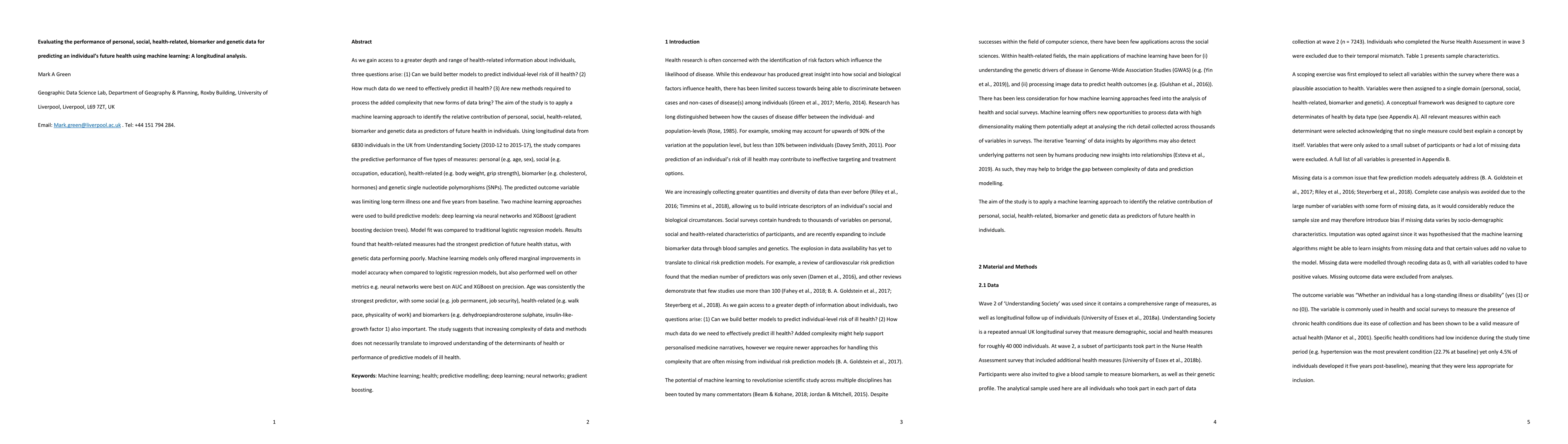 As we gain access to a greater depth and range of health-related information about individuals, three questions arise: (1) Can we build better models to predict individual-level risk of ill health? (2) How much data do we need to effectively predict ill health? (3) Are new methods required to process the added complexity that new forms of data bring? The aim of the study is to apply a machine learning approach to identify the relative contribution of personal, social, health-related, biomarker and genetic data as predictors of future health in individuals. Using longitudinal data from 6830 individuals in the UK from Understanding Society (2010-12 to 2015-17), the study compares the predictive performance of five types of measures: personal (e.g. age, sex), social (e.g. occupation, education), health-related (e.g. body weight, grip strength), biomarker (e.g. cholesterol, hormones) and genetic single nucleotide polymorphisms (SNPs). The predicted outcome variable was limiting long-term illness one and five years from baseline. Two machine learning approaches were used to build predictive models: deep learning via neural networks and XGBoost (gradient boosting decision trees). Model fit was compared to traditional logistic regression models. Results found that health-related measures had the strongest prediction of future health status, with genetic data performing poorly. Machine learning models only offered marginal improvements in model accuracy when compared to logistic regression models, but also performed well on other metrics e.g. neural networks were best on AUC and XGBoost on precision. The study suggests that increasing complexity of data and methods does not necessarily translate to improved understanding of the determinants of health or performance of predictive models of ill health.