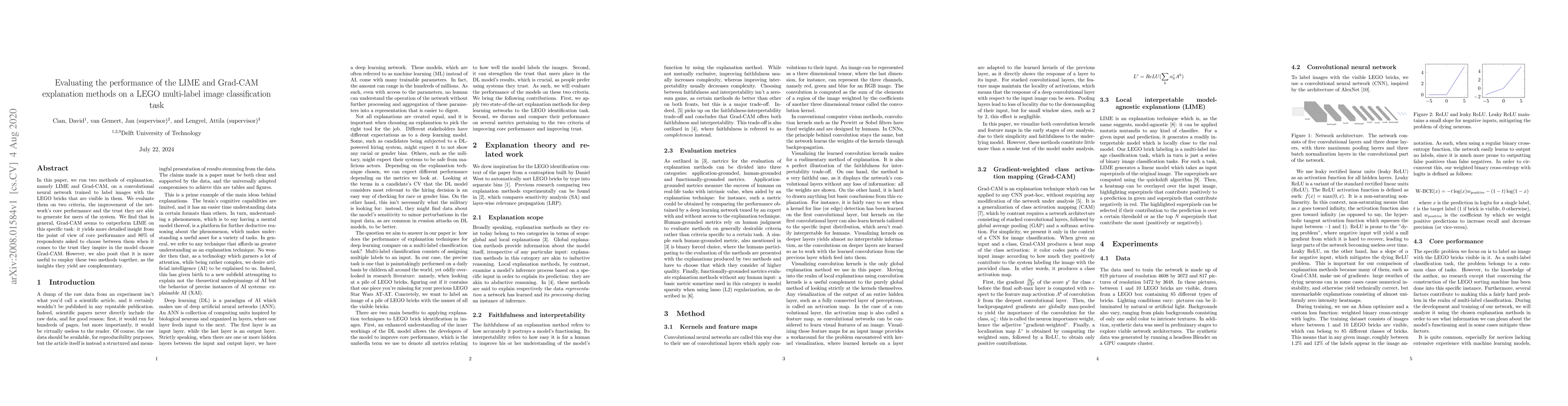 In this paper, we run two methods of explanation, namely LIME and Grad-CAM, on a convolutional neural network trained to label images with the LEGO bricks that are visible in them. We evaluate them on two criteria, the improvement of the network's core performance and the trust they are able to generate for users of the system. We find that in general, Grad-CAM seems to outperform LIME on this specific task: it yields more detailed insight from the point of view of core performance and 80\% of respondents asked to choose between them when it comes to the trust they inspire in the model choose Grad-CAM. However, we also posit that it is more useful to employ these two methods together, as the insights they yield are complementary.