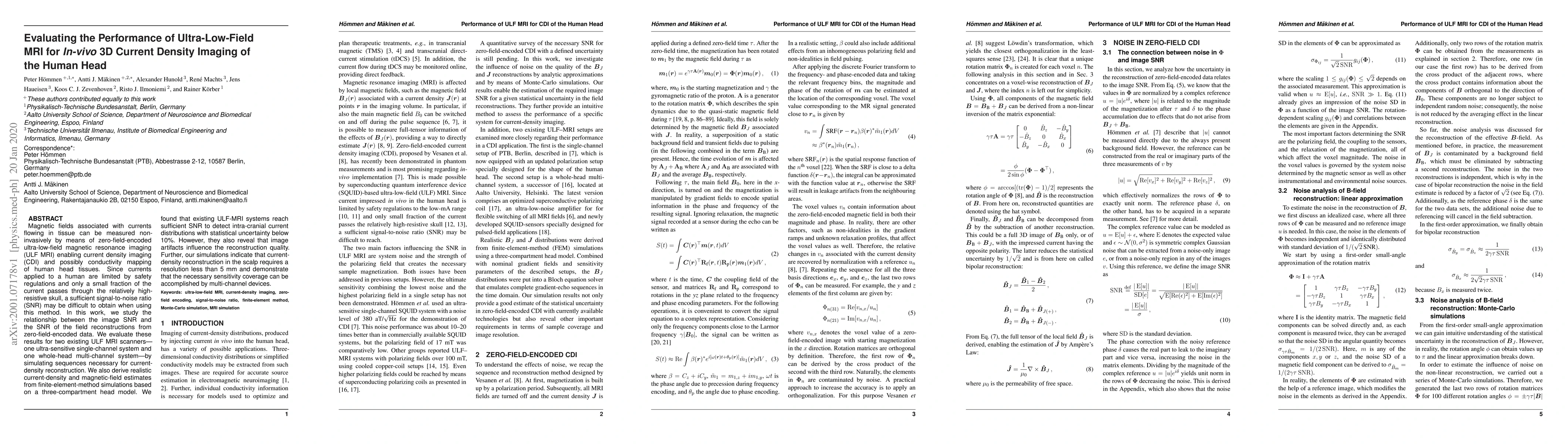This paper evaluates the performance of ultra-low-field MRI for detecting in-vivo 3D current density in the human head, finding that existing ULF-MRI systems achieve sufficient SNR for reliable current distribution detection, but suffer from image artifacts that affect reconstruction quality. The study suggests that multi-channel devices provide the necessary sensitivity for scalp current-density reconstruction.
