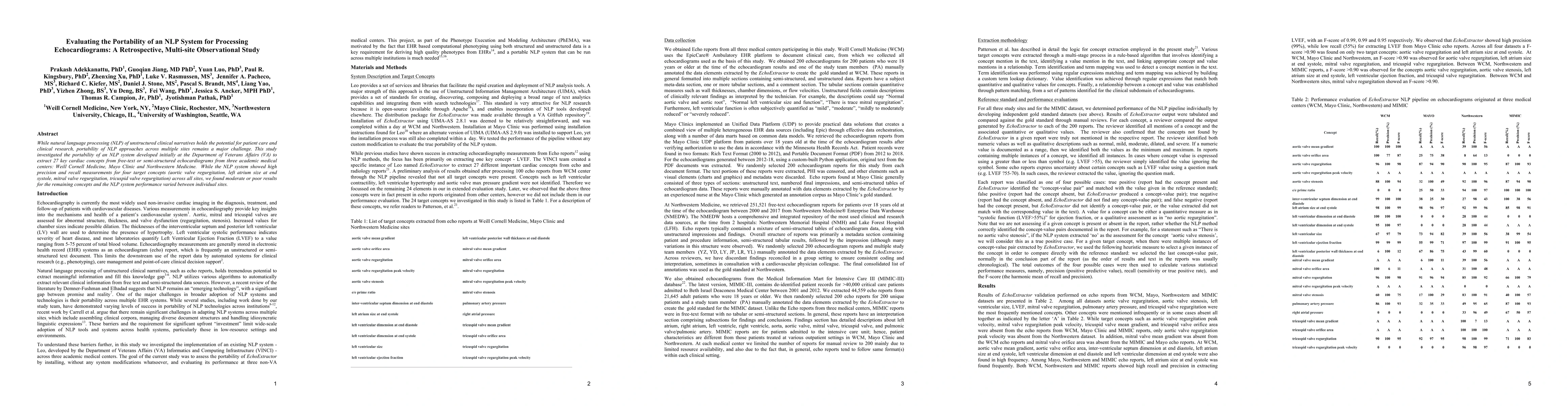 While natural language processing (NLP) of unstructured clinical narratives holds the potential for patient care and clinical research, portability of NLP approaches across multiple sites remains a major challenge. This study investigated the portability of an NLP system developed initially at the Department of Veterans Affairs (VA) to extract 27 key cardiac concepts from free-text or semi-structured echocardiograms from three academic medical centers: Weill Cornell Medicine, Mayo Clinic and Northwestern Medicine. While the NLP system showed high precision and recall measurements for four target concepts (aortic valve regurgitation, left atrium size at end systole, mitral valve regurgitation, tricuspid valve regurgitation) across all sites, we found moderate or poor results for the remaining concepts and the NLP system performance varied between individual sites.