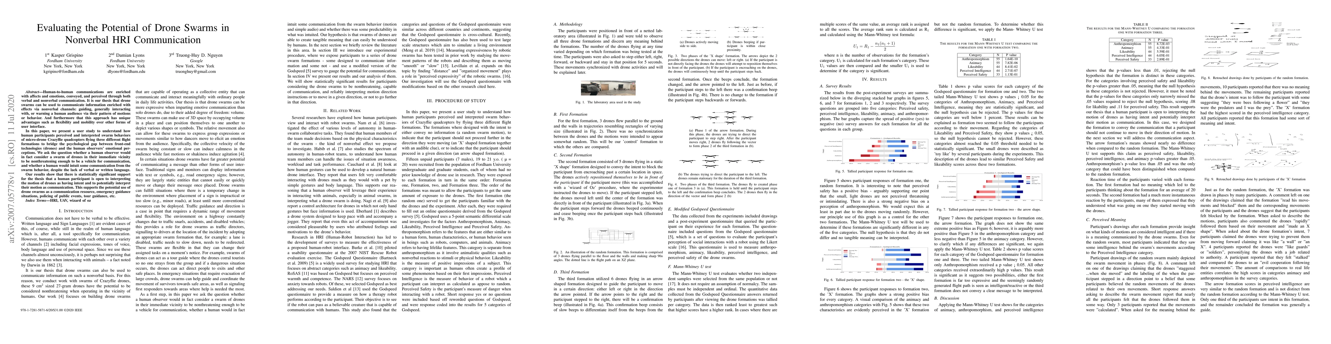 A user study found that humans can interpret drone swarm behavior as communication, suggesting drones could be used for nonverbal HRI (Human-Robot Interaction) in flexible and mobile ways.