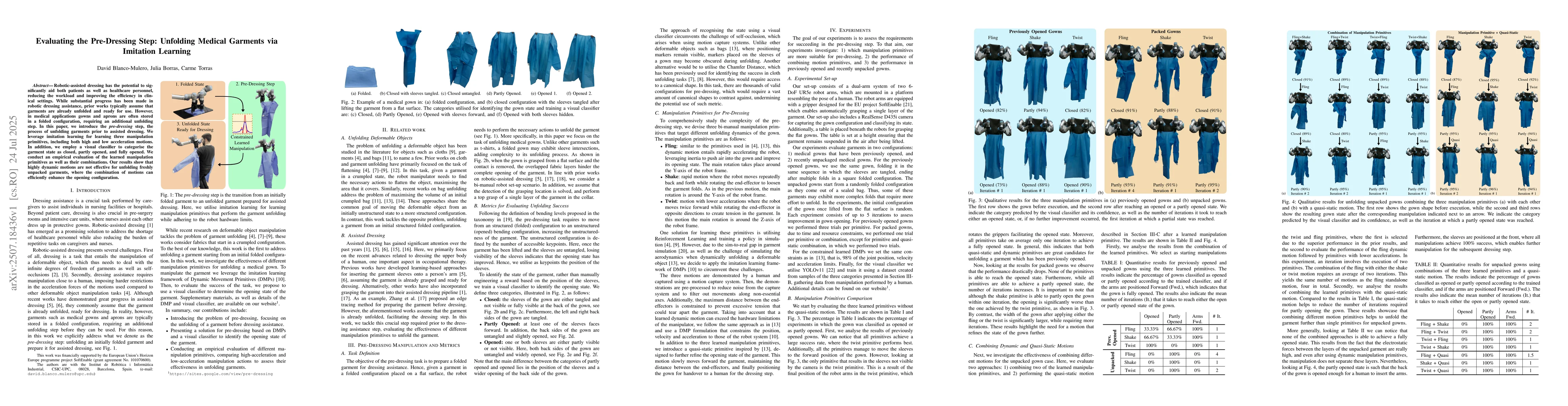 Robotic-assisted dressing has the potential to significantly aid both patients as well as healthcare personnel, reducing the workload and improving the efficiency in clinical settings. While substantial progress has been made in robotic dressing assistance, prior works typically assume that garments are already unfolded and ready for use. However, in medical applications gowns and aprons are often stored in a folded configuration, requiring an additional unfolding step. In this paper, we introduce the pre-dressing step, the process of unfolding garments prior to assisted dressing. We leverage imitation learning for learning three manipulation primitives, including both high and low acceleration motions. In addition, we employ a visual classifier to categorise the garment state as closed, partly opened, and fully opened. We conduct an empirical evaluation of the learned manipulation primitives as well as their combinations. Our results show that highly dynamic motions are not effective for unfolding freshly unpacked garments, where the combination of motions can efficiently enhance the opening configuration.