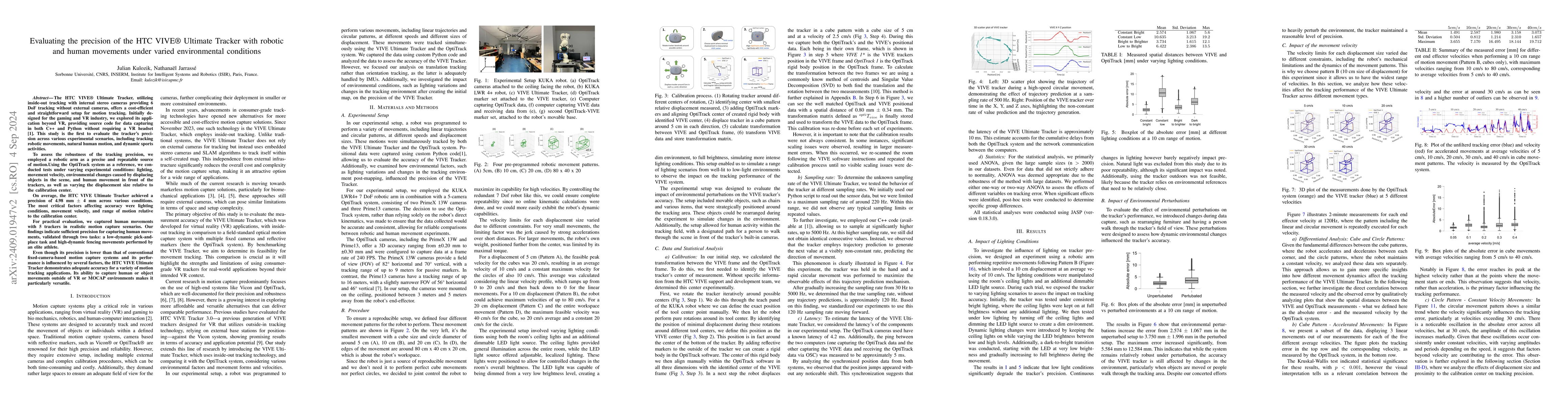 This study evaluates the precision of the HTC VIVE Ultimate Tracker under various environmental conditions using both robotic and human movements. Findings show an average tracking precision of 4.98 mm +/- 4 mm, with lighting, velocity, and range of motion being the main accuracy influencers, making it suitable for diverse motion tracking applications despite its lower precision compared to conventional systems.