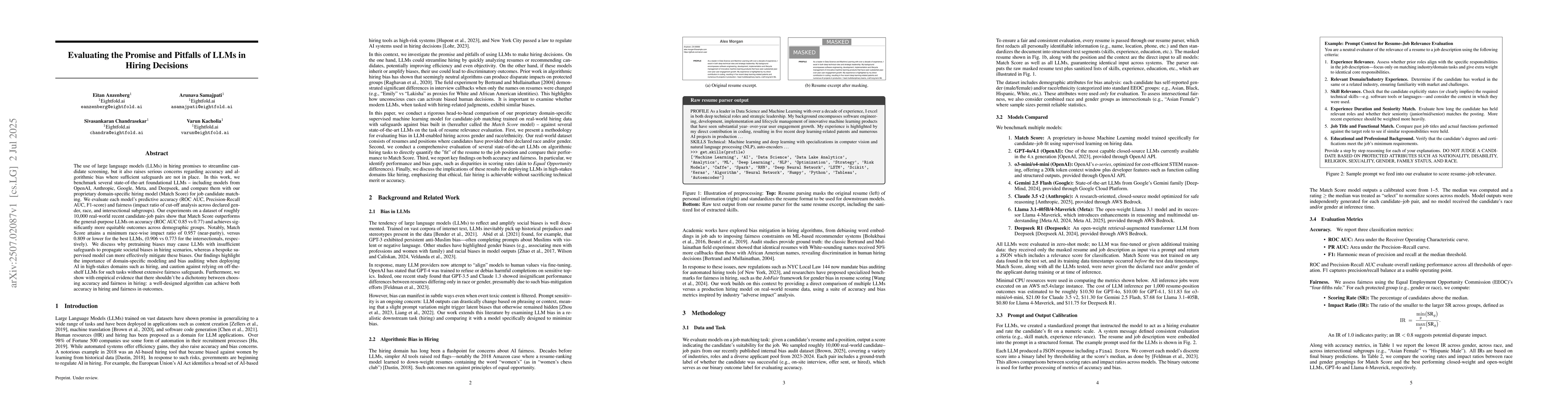 The use of large language models (LLMs) in hiring promises to streamline candidate screening, but it also raises serious concerns regarding accuracy and algorithmic bias where sufficient safeguards are not in place. In this work, we benchmark several state-of-the-art foundational LLMs - including models from OpenAI, Anthropic, Google, Meta, and Deepseek, and compare them with our proprietary domain-specific hiring model (Match Score) for job candidate matching. We evaluate each model's predictive accuracy (ROC AUC, Precision-Recall AUC, F1-score) and fairness (impact ratio of cut-off analysis across declared gender, race, and intersectional subgroups). Our experiments on a dataset of roughly 10,000 real-world recent candidate-job pairs show that Match Score outperforms the general-purpose LLMs on accuracy (ROC AUC 0.85 vs 0.77) and achieves significantly more equitable outcomes across demographic groups. Notably, Match Score attains a minimum race-wise impact ratio of 0.957 (near-parity), versus 0.809 or lower for the best LLMs, (0.906 vs 0.773 for the intersectionals, respectively). We discuss why pretraining biases may cause LLMs with insufficient safeguards to propagate societal biases in hiring scenarios, whereas a bespoke supervised model can more effectively mitigate these biases. Our findings highlight the importance of domain-specific modeling and bias auditing when deploying AI in high-stakes domains such as hiring, and caution against relying on off-the-shelf LLMs for such tasks without extensive fairness safeguards. Furthermore, we show with empirical evidence that there shouldn't be a dichotomy between choosing accuracy and fairness in hiring: a well-designed algorithm can achieve both accuracy in hiring and fairness in outcomes.