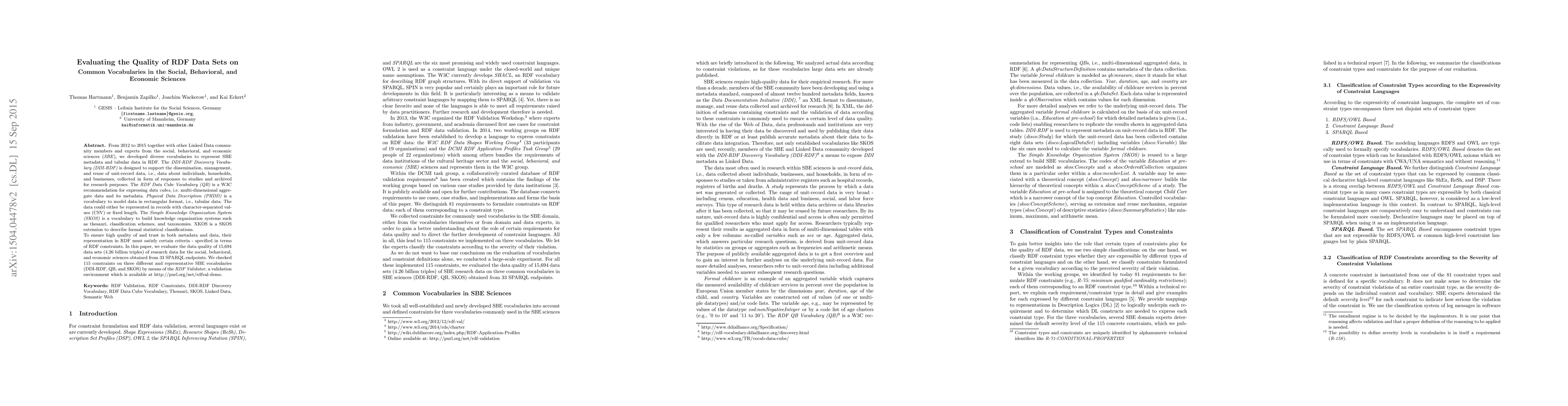 The paper presents a comprehensive set of 115 constraints for RDF data quality evaluation, classified by severity and expressibility in different constraint languages.