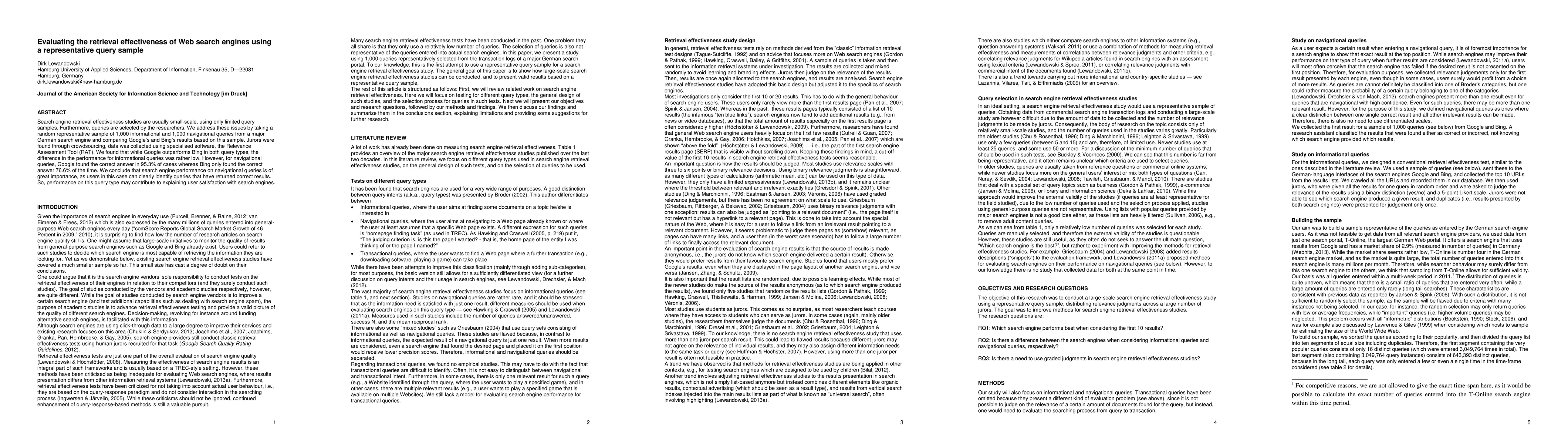 Search engine retrieval effectiveness studies are usually small-scale, using only limited query samples. Furthermore, queries are selected by the researchers. We address these issues by taking a random representative sample of 1,000 informational and 1,000 navigational queries from a major German search engine and comparing Google's and Bing's results based on this sample. Jurors were found through crowdsourcing, data was collected using specialised software, the Relevance Assessment Tool (RAT). We found that while Google outperforms Bing in both query types, the difference in the performance for informational queries was rather low. However, for navigational queries, Google found the correct answer in 95.3 per cent of cases whereas Bing only found the correct answer 76.6 per cent of the time. We conclude that search engine performance on navigational queries is of great importance, as users in this case can clearly identify queries that have returned correct results. So, performance on this query type may contribute to explaining user satisfaction with search engines.