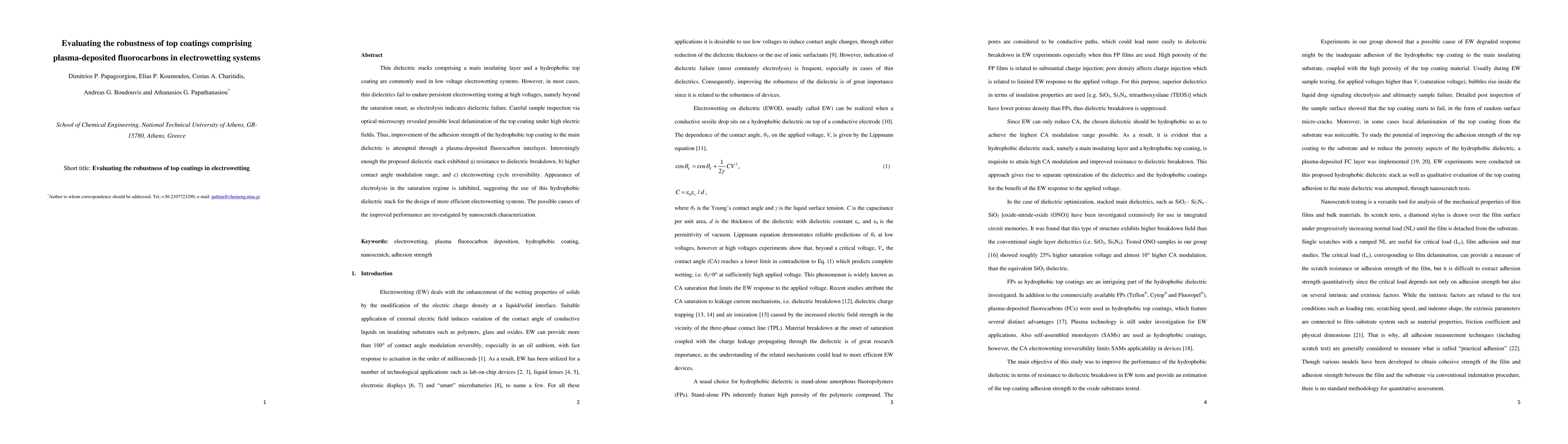 This study evaluates the robustness of electrowetting systems using top coatings with plasma-deposited fluorocarbons, finding improved adhesion, breakdown resistance, and electrowetting performance. Nanoscratch characterization helps to understand the enhanced durability and efficiency of the new dielectric stacks.