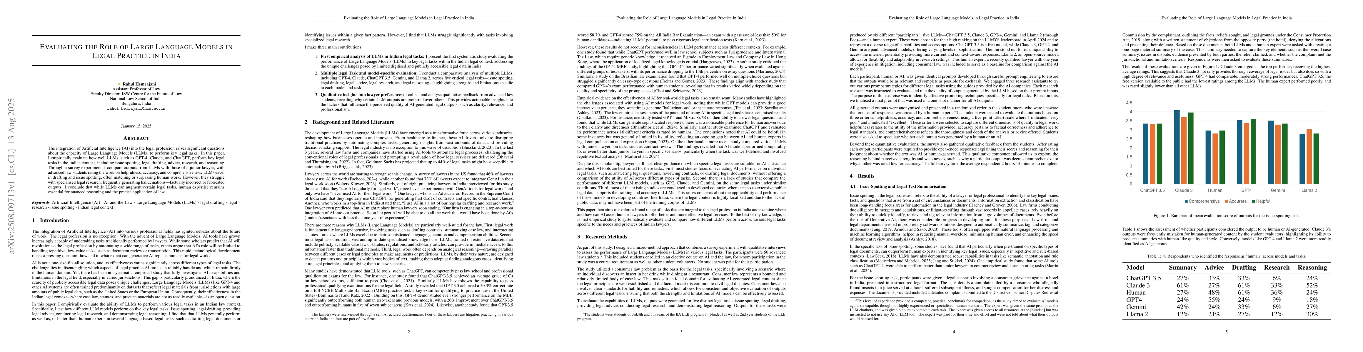The integration of Artificial Intelligence(AI) into the legal profession raises significant questions about the capacity of Large Language Models(LLM) to perform key legal tasks. In this paper, I empirically evaluate how well LLMs, such as GPT, Claude, and Llama, perform key legal tasks in the Indian context, including issue spotting, legal drafting, advice, research, and reasoning. Through a survey experiment, I compare outputs from LLMs with those of a junior lawyer, with advanced law students rating the work on helpfulness, accuracy, and comprehensiveness. LLMs excel in drafting and issue spotting, often matching or surpassing human work. However, they struggle with specialised legal research, frequently generating hallucinations, factually incorrect or fabricated outputs. I conclude that while LLMs can augment certain legal tasks, human expertise remains essential for nuanced reasoning and the precise application of law.
