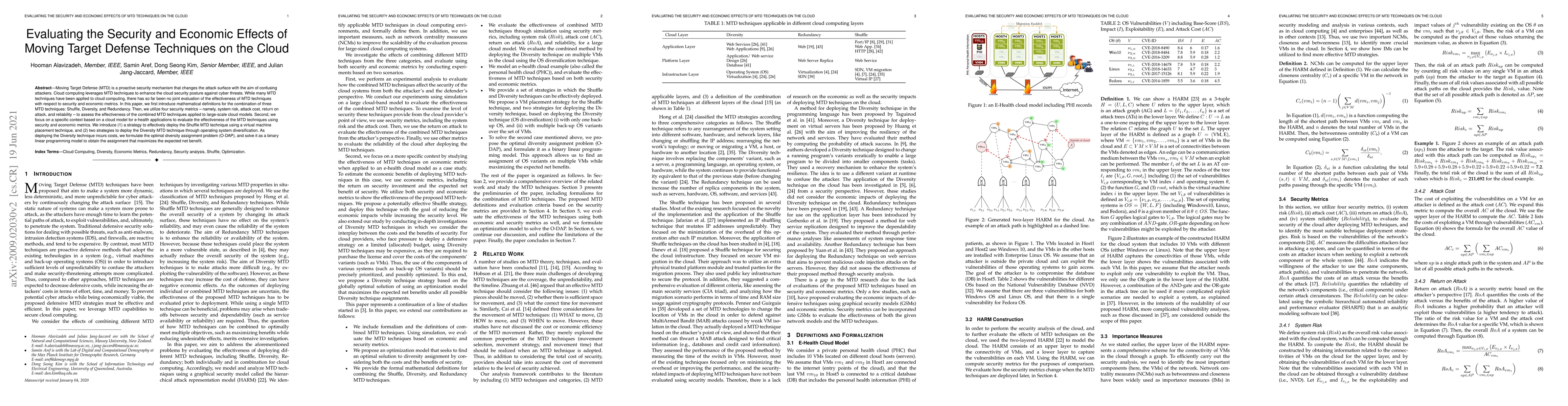Moving Target Defense (MTD) is a proactive security mechanism which changes the attack surface aiming to confuse attackers. Cloud computing leverages MTD techniques to enhance cloud security posture against cyber threats. While many MTD techniques have been applied to cloud computing, there has not been a joint evaluation of the effectiveness of MTD techniques with respect to security and economic metrics. In this paper, we first introduce mathematical definitions for the combination of three MTD techniques: \emph{Shuffle}, \emph{Diversity}, and \emph{Redundancy}. Then, we utilize four security metrics including system risk, attack cost, return on attack, and reliability to assess the effectiveness of the combined MTD techniques applied to large-scale cloud models. Secondly, we focus on a specific context based on a cloud model for E-health applications to evaluate the effectiveness of the MTD techniques using security and economic metrics. We introduce (1) a strategy to effectively deploy Shuffle MTD technique using a virtual machine placement technique and (2) two strategies to deploy Diversity MTD technique through operating system diversification. As deploying Diversity incurs cost, we formulate the \emph{Optimal Diversity Assignment Problem (O-DAP)} and solve it as a binary linear programming model to obtain the assignment which maximizes the expected net benefit.