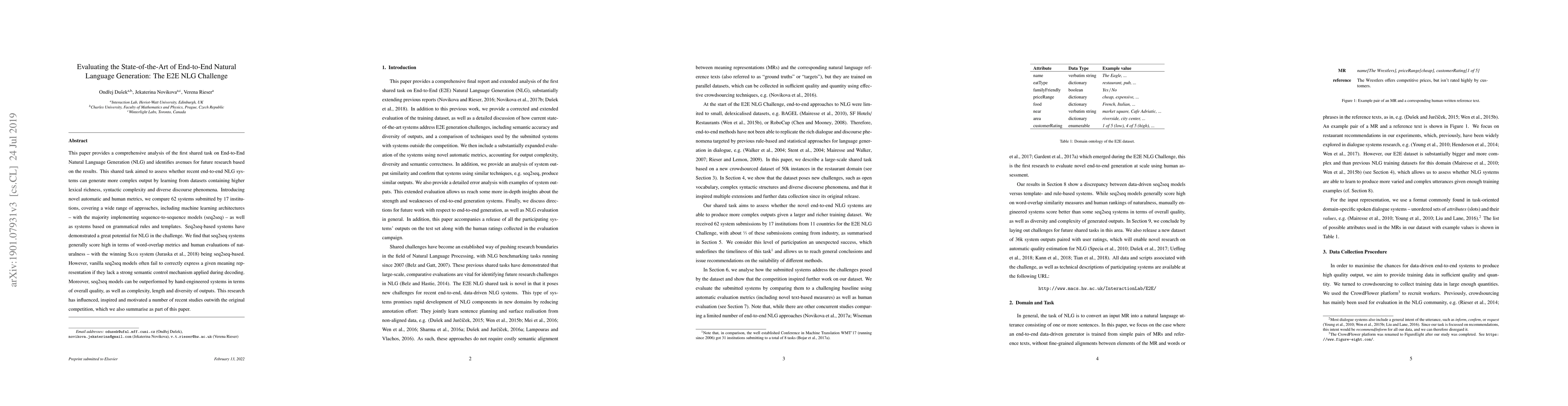 This paper evaluates the first shared task on End-to-End Natural Language Generation (NLG), comparing 62 systems from 17 institutions. Seq2seq models, especially the winning SLUG, excel in word-overlap and naturalness but often lack semantic control, while hand-engineered systems can outperform them in overall quality.