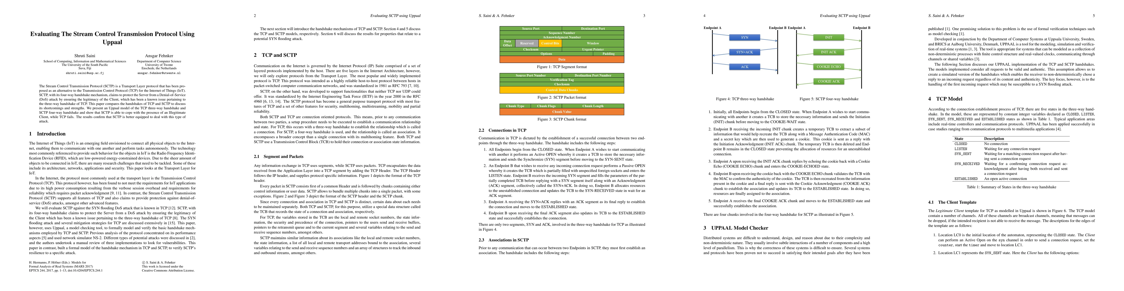 The Stream Control Transmission Protocol (SCTP) is a Transport Layer protocol that has been proposed as an alternative to the Transmission Control Protocol (TCP) for the Internet of Things (IoT). SCTP, with its four-way handshake mechanism, claims to protect the Server from a Denial-of-Service (DoS) attack by ensuring the legitimacy of the Client, which has been a known issue pertaining to the three-way handshake of TCP. This paper compares the handshakes of TCP and SCTP to discuss its shortcomings and strengths. We present an Uppaal model of the TCP three-way handshake and SCTP four-way handshake and show that SCTP is able to cope with the presence of an Illegitimate Client, while TCP fails. The results confirm that SCTP is better equipped to deal with this type of attack.