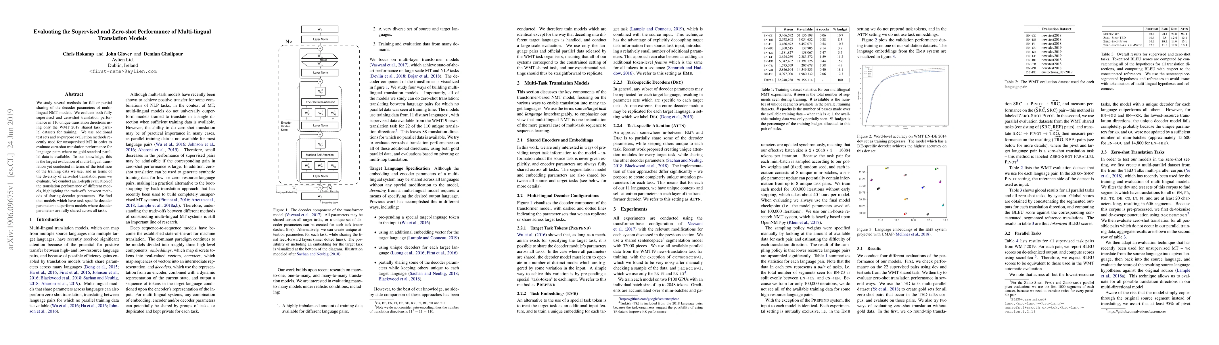 We study several methods for full or partial sharing of the decoder parameters of multilingual NMT models. We evaluate both fully supervised and zero-shot translation performance in 110 unique translation directions using only the WMT 2019 shared task parallel datasets for training. We use additional test sets and re-purpose evaluation methods recently used for unsupervised MT in order to evaluate zero-shot translation performance for language pairs where no gold-standard parallel data is available. To our knowledge, this is the largest evaluation of multi-lingual translation yet conducted in terms of the total size of the training data we use, and in terms of the diversity of zero-shot translation pairs we evaluate. We conduct an in-depth evaluation of the translation performance of different models, highlighting the trade-offs between methods of sharing decoder parameters. We find that models which have task-specific decoder parameters outperform models where decoder parameters are fully shared across all tasks.