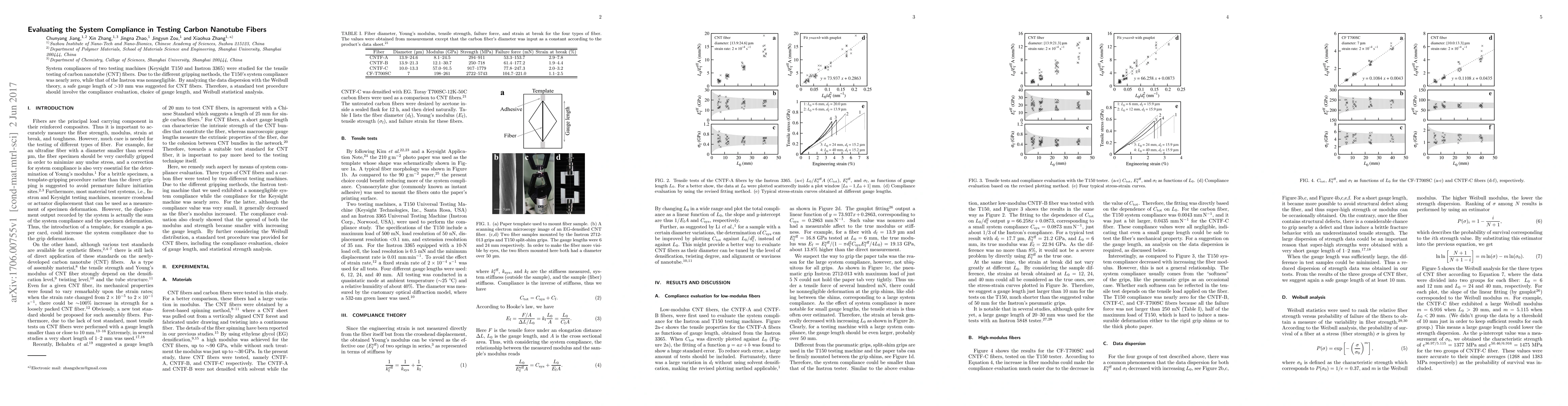 System compliances of two testing machines (Keysight T150 and Instron 3365) were studied for the tensile testing of carbon nanotube (CNT) fibers. Due to the different gripping methods, the T150's system compliance was nearly zero, while that of the Instron was nonnegligible. By analyzing the data dispersion with the Weibull theory, a safe gauge length of >10 mm was suggested for CNT fibers. Therefore, a standard test procedure should involve the compliance evaluation, choice of gauge length, and Weibull statistical analysis.
