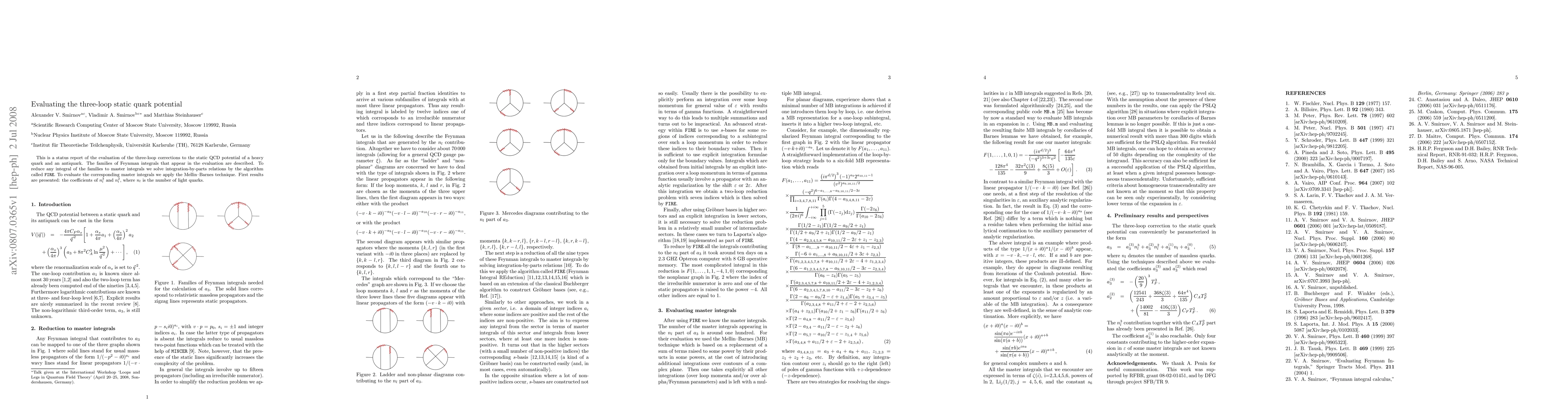This is a status report of the evaluation of the three-loop corrections to the static QCD potential of a heavy quark and an antiquark. The families of Feynman integrals that appear in the evaluation are described. To reduce any integral of the families to master integrals we solve integration-by-parts relations by the algorithm called FIRE. To evaluate the corresponding master integrals we apply the Mellin-Barnes technique. First results are presented: the coefficients of n_l^3 and n_l^2, where n_l is the number of light quarks.