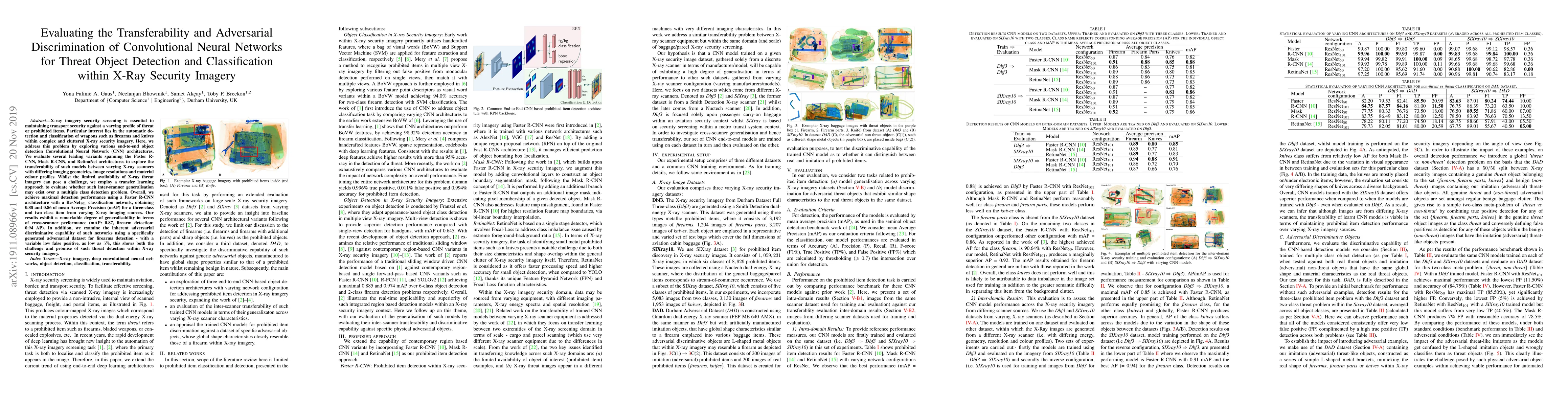 This work differentiates itself by focusing on the transferability and adversarial discrimination of CNN models for threat object detection in X-ray security imagery, providing insights into their performance across varying scanner configurations.