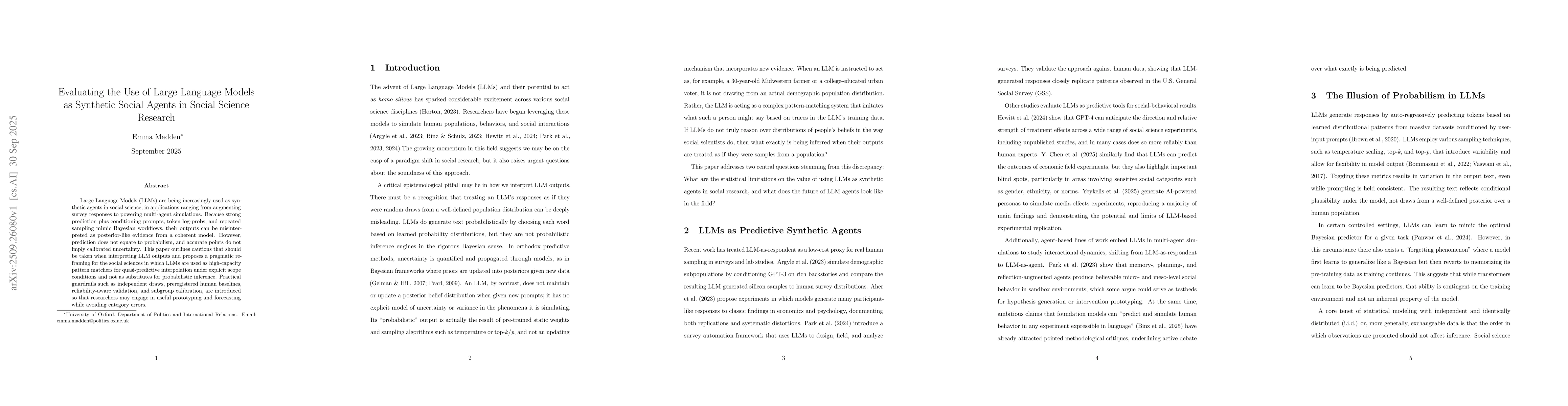 Large Language Models (LLMs) are being increasingly used as synthetic agents in social science, in applications ranging from augmenting survey responses to powering multi-agent simulations. Because strong prediction plus conditioning prompts, token log-probs, and repeated sampling mimic Bayesian workflows, their outputs can be misinterpreted as posterior-like evidence from a coherent model. However, prediction does not equate to probabilism, and accurate points do not imply calibrated uncertainty. This paper outlines cautions that should be taken when interpreting LLM outputs and proposes a pragmatic reframing for the social sciences in which LLMs are used as high-capacity pattern matchers for quasi-predictive interpolation under explicit scope conditions and not as substitutes for probabilistic inference. Practical guardrails such as independent draws, preregistered human baselines, reliability-aware validation, and subgroup calibration, are introduced so that researchers may engage in useful prototyping and forecasting while avoiding category errors.