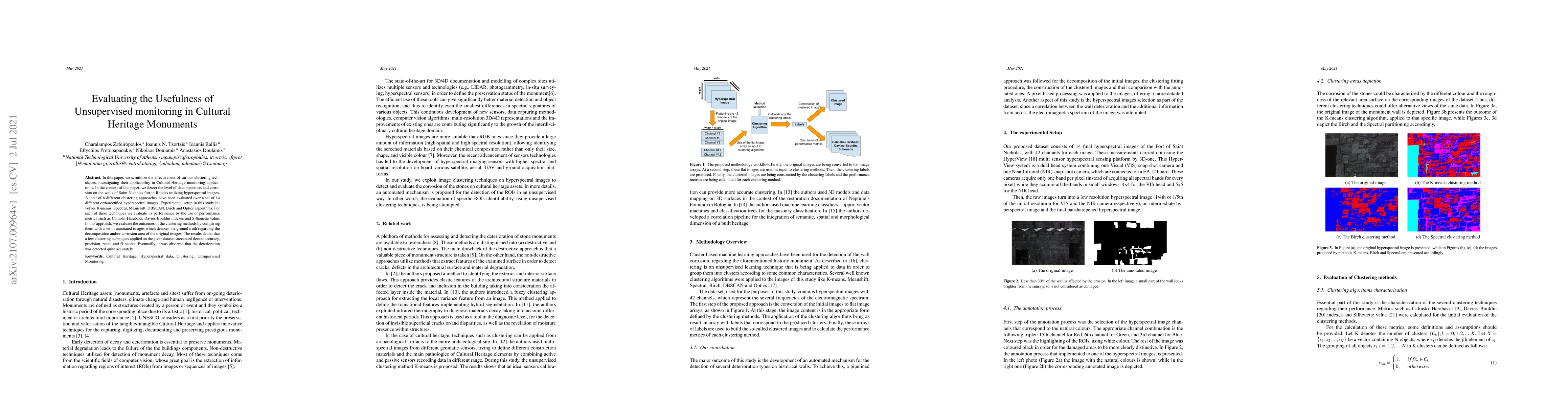 In this paper, we scrutinize the effectiveness of various clustering techniques, investigating their applicability in Cultural Heritage monitoring applications. In the context of this paper, we detect the level of decomposition and corrosion on the walls of Saint Nicholas fort in Rhodes utilizing hyperspectral images. A total of 6 different clustering approaches have been evaluated over a set of 14 different orthorectified hyperspectral images. Experimental setup in this study involves K-means, Spectral, Meanshift, DBSCAN, Birch and Optics algorithms. For each of these techniques we evaluate its performance by the use of performance metrics such as Calinski-Harabasz, Davies-Bouldin indexes and Silhouette value. In this approach, we evaluate the outcomes of the clustering methods by comparing them with a set of annotated images which denotes the ground truth regarding the decomposition and/or corrosion area of the original images. The results depict that a few clustering techniques applied on the given dataset succeeded decent accuracy, precision, recall and f1 scores. Eventually, it was observed that the deterioration was detected quite accurately.