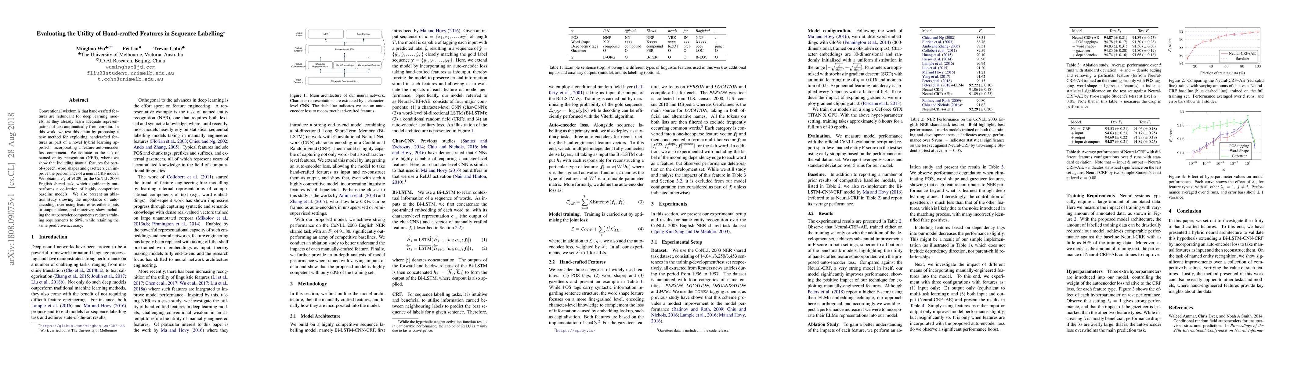 Conventional wisdom is that hand-crafted features are redundant for deep learning models, as they already learn adequate representations of text automatically from corpora. In this work, we test this claim by proposing a new method for exploiting handcrafted features as part of a novel hybrid learning approach, incorporating a feature auto-encoder loss component. We evaluate on the task of named entity recognition (NER), where we show that including manual features for part-of-speech, word shapes and gazetteers can improve the performance of a neural CRF model. We obtain a $F_1$ of 91.89 for the CoNLL-2003 English shared task, which significantly outperforms a collection of highly competitive baseline models. We also present an ablation study showing the importance of auto-encoding, over using features as either inputs or outputs alone, and moreover, show including the autoencoder components reduces training requirements to 60\%, while retaining the same predictive accuracy.