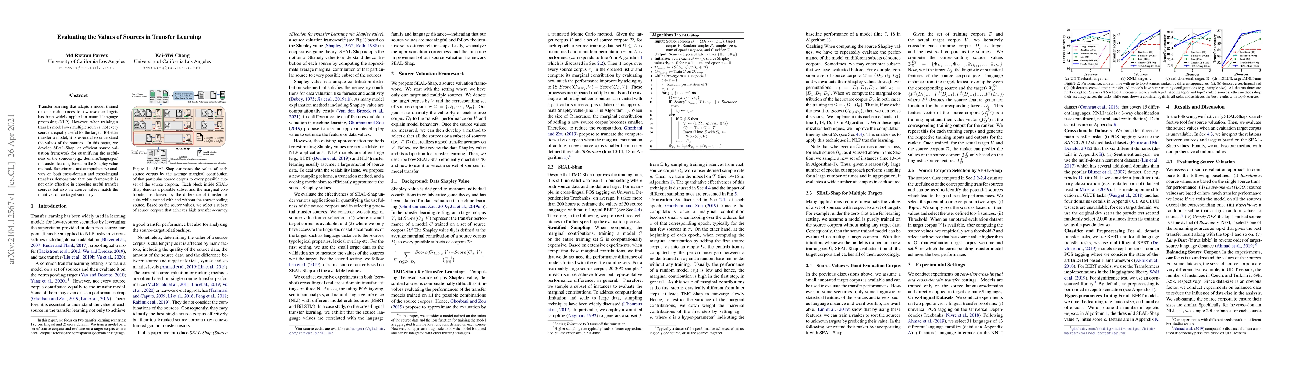 Transfer learning that adapts a model trained on data-rich sources to low-resource targets has been widely applied in natural language processing (NLP). However, when training a transfer model over multiple sources, not every source is equally useful for the target. To better transfer a model, it is essential to understand the values of the sources. In this paper, we develop SEAL-Shap, an efficient source valuation framework for quantifying the usefulness of the sources (e.g., domains/languages) in transfer learning based on the Shapley value method. Experiments and comprehensive analyses on both cross-domain and cross-lingual transfers demonstrate that our framework is not only effective in choosing useful transfer sources but also the source values match the intuitive source-target similarity.