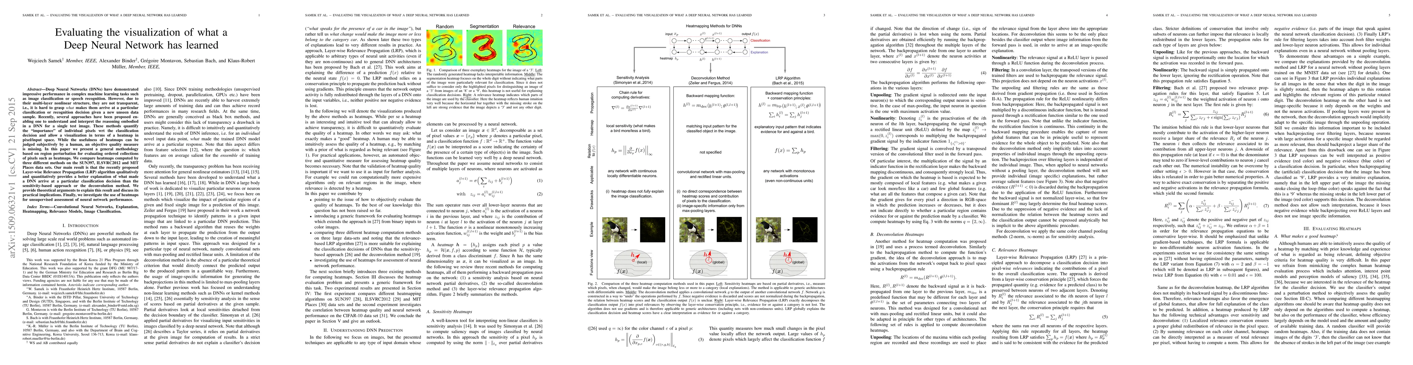 Deep Neural Networks (DNNs) have demonstrated impressive performance in complex machine learning tasks such as image classification or speech recognition. However, due to their multi-layer nonlinear structure, they are not transparent, i.e., it is hard to grasp what makes them arrive at a particular classification or recognition decision given a new unseen data sample. Recently, several approaches have been proposed enabling one to understand and interpret the reasoning embodied in a DNN for a single test image. These methods quantify the ''importance'' of individual pixels wrt the classification decision and allow a visualization in terms of a heatmap in pixel/input space. While the usefulness of heatmaps can be judged subjectively by a human, an objective quality measure is missing. In this paper we present a general methodology based on region perturbation for evaluating ordered collections of pixels such as heatmaps. We compare heatmaps computed by three different methods on the SUN397, ILSVRC2012 and MIT Places data sets. Our main result is that the recently proposed Layer-wise Relevance Propagation (LRP) algorithm qualitatively and quantitatively provides a better explanation of what made a DNN arrive at a particular classification decision than the sensitivity-based approach or the deconvolution method. We provide theoretical arguments to explain this result and discuss its practical implications. Finally, we investigate the use of heatmaps for unsupervised assessment of neural network performance.