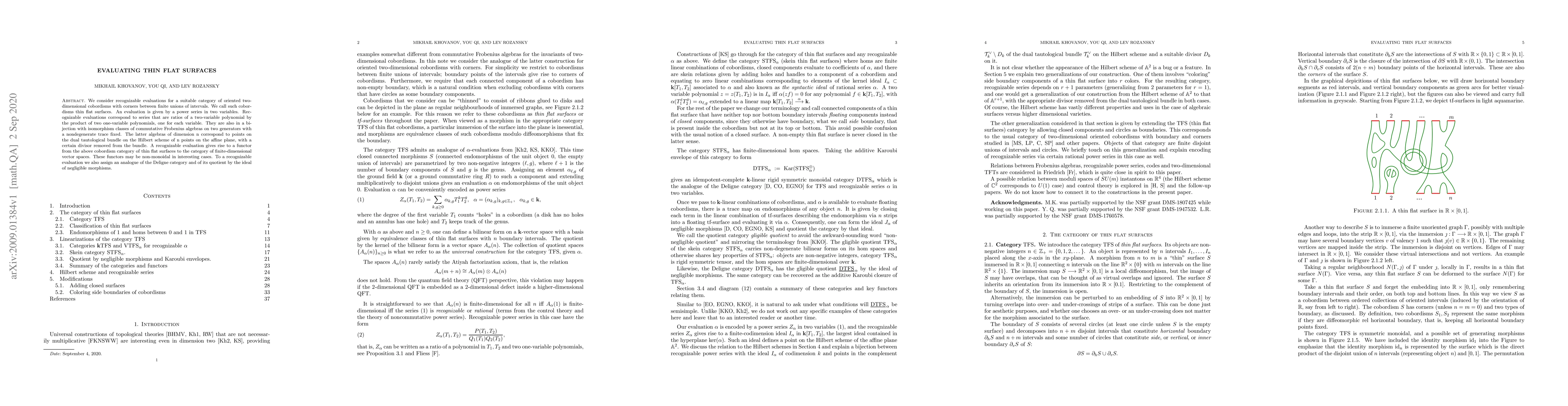 We consider recognizable evaluations for a suitable category of oriented two-dimensional cobordisms with corners between finite unions of intervals. We call such cobordisms thin flat surfaces. An evaluation is given by a power series in two variables. Recognizable evaluations correspond to series that are ratios of a two-variable polynomial by the product of two one-variable polynomials, one for each variable. They are also in a bijection with isomorphism classes of commutative Frobenius algebras on two generators with a nondegenerate trace fixed. The latter algebras of dimension n correspond to points on the dual tautological bundle on the Hilbert scheme of n points on the affine plane, with a certain divisor removed from the bundle. A recognizable evaluation gives rise to a functor from the above cobordism category of thin flat surfaces to the category of finite-dimensional vector spaces. These functors may be non-monoidal in interesting cases. To a recognizable evaluation we also assign an analogue of the Deligne category and of its quotient by the ideal of negligible morphisms.