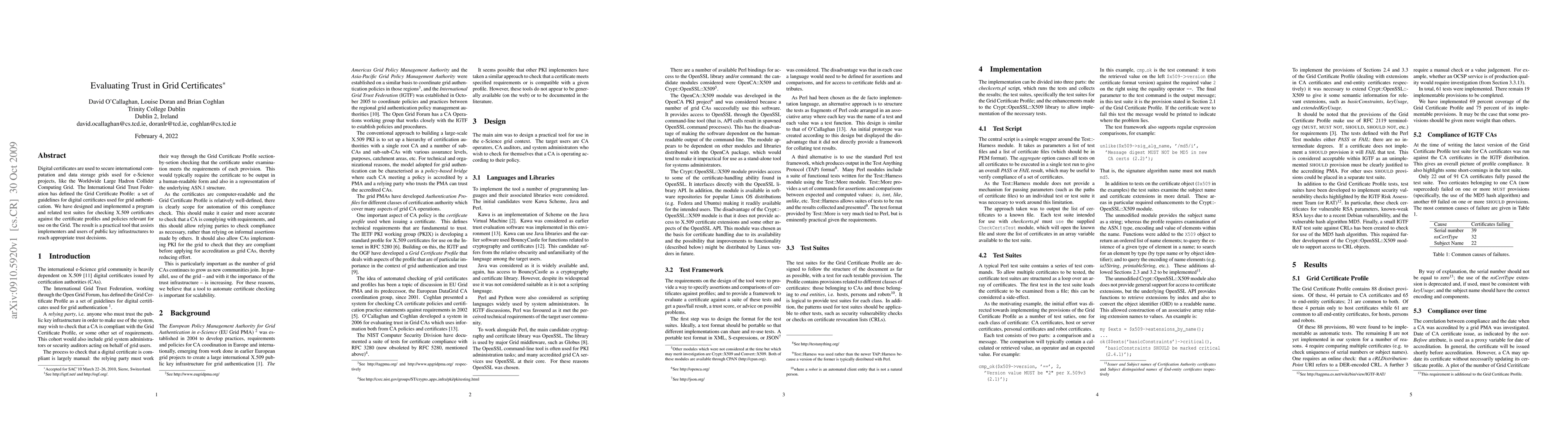 This paper presents a program and test suites for evaluating X.509 certificates against the Grid Certificate Profile guidelines, aiding in trust decisions for e-Science projects like the Worldwide Large Hadron Collider Computing Grid. The tool supports public key infrastructures in grid authentication.