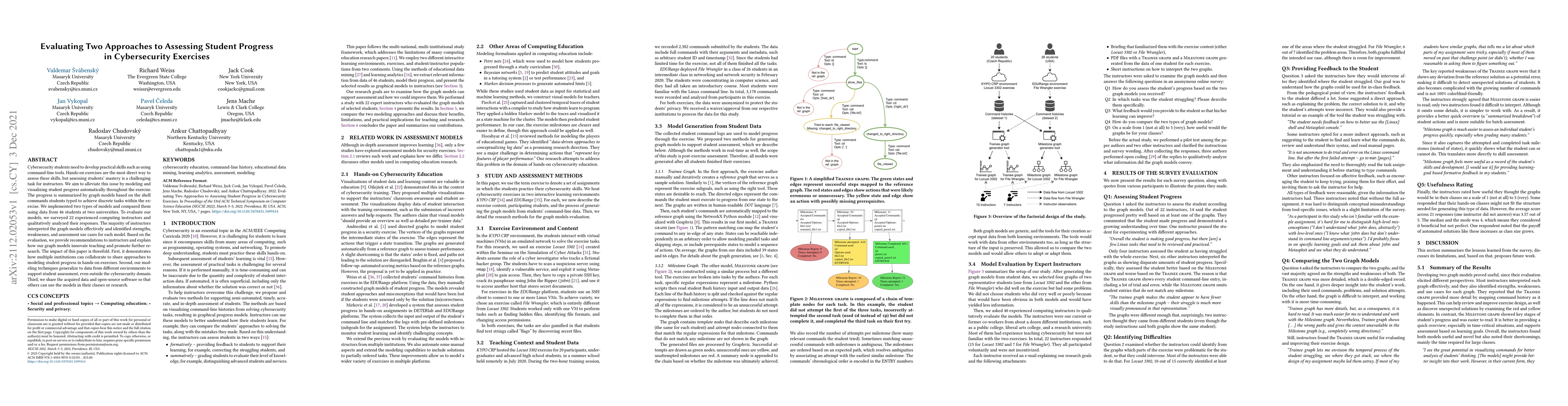 This paper evaluates two approaches for automatically assessing cybersecurity students' progress through hands-on exercises using graph models based on shell commands. The study found that instructors effectively interpreted the models, leading to recommendations for improved teaching and assessment strategies.