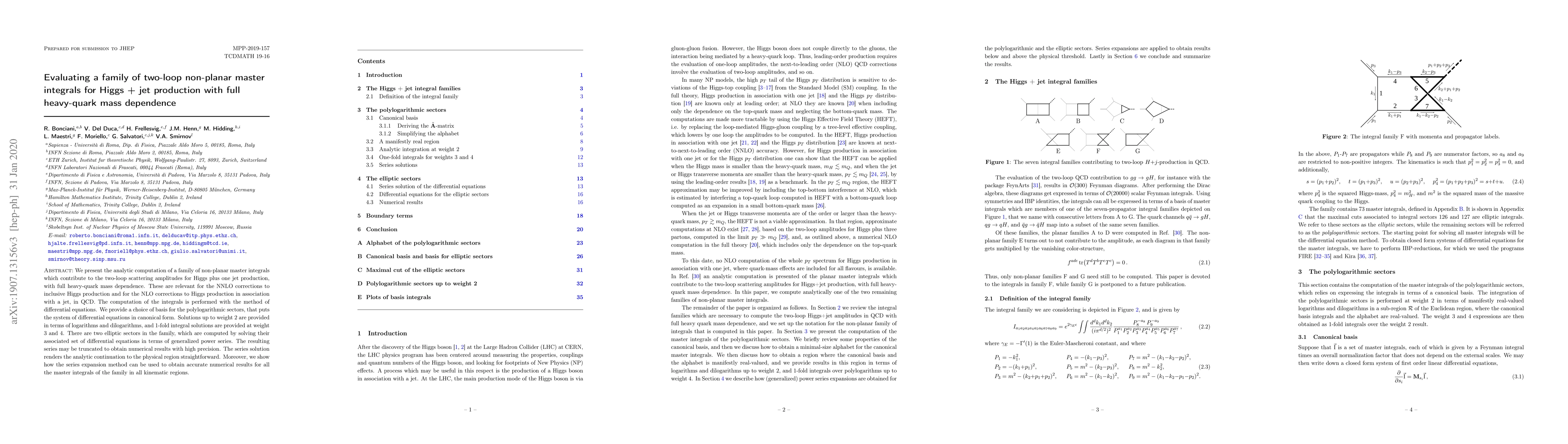 We present the analytic computation of a family of non-planar master integrals which contribute to the two-loop scattering amplitudes for Higgs plus one jet production, with full heavy-quark mass dependence. These are relevant for the NNLO corrections to inclusive Higgs production and for the NLO corrections to Higgs production in association with a jet, in QCD. The computation of the integrals is performed with the method of differential equations. We provide a choice of basis for the polylogarithmic sectors, that puts the system of differential equations in canonical form. Solutions up to weight 2 are provided in terms of logarithms and dilogarithms, and 1-fold integral solutions are provided at weight 3 and 4. There are two elliptic sectors in the family, which are computed by solving their associated set of differential equations in terms of generalized power series. The resulting series may be truncated to obtain numerical results with high precision. The series solution renders the analytic continuation to the physical region straightforward. Moreover, we show how the series expansion method can be used to obtain accurate numerical results for all the master integrals of the family in all kinematic regions.