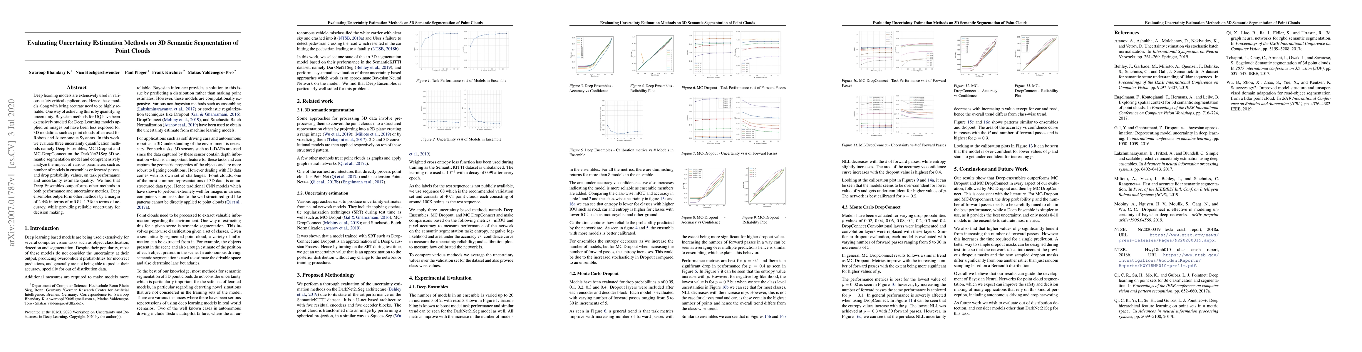 This paper evaluates three uncertainty estimation methods for 3D semantic segmentation of point clouds using Deep Ensembles, MC-Dropout, and MC-DropConnect on the DarkNet21Seg model. Deep Ensembles are found to outperform both in performance metrics and uncertainty estimation, achieving better mIOU and accuracy while providing reliable uncertainty for decision-making.