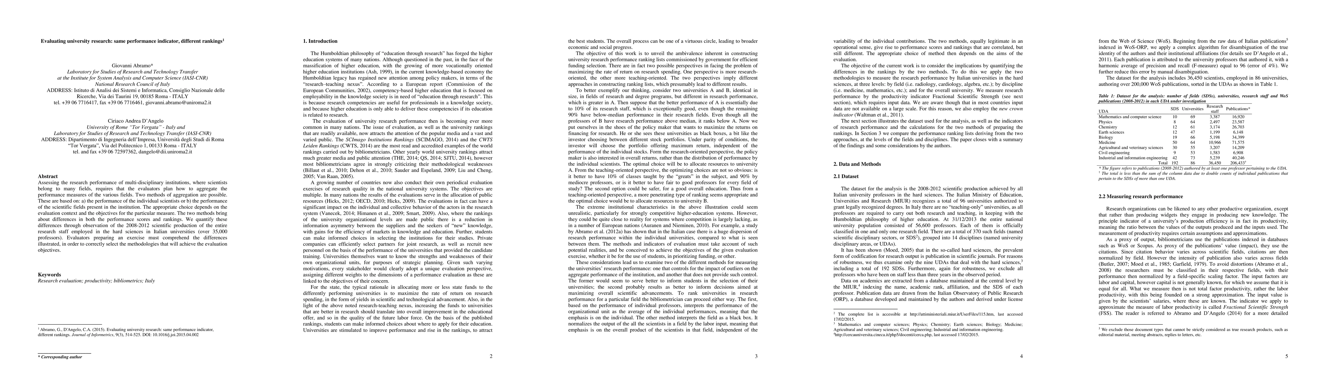 This paper evaluates how different aggregation methods for assessing research performance in multi-disciplinary universities lead to varying rankings, using Italian university hard science staff from 2008-2012. It highlights the importance of choosing the right methodology based on evaluation objectives.
