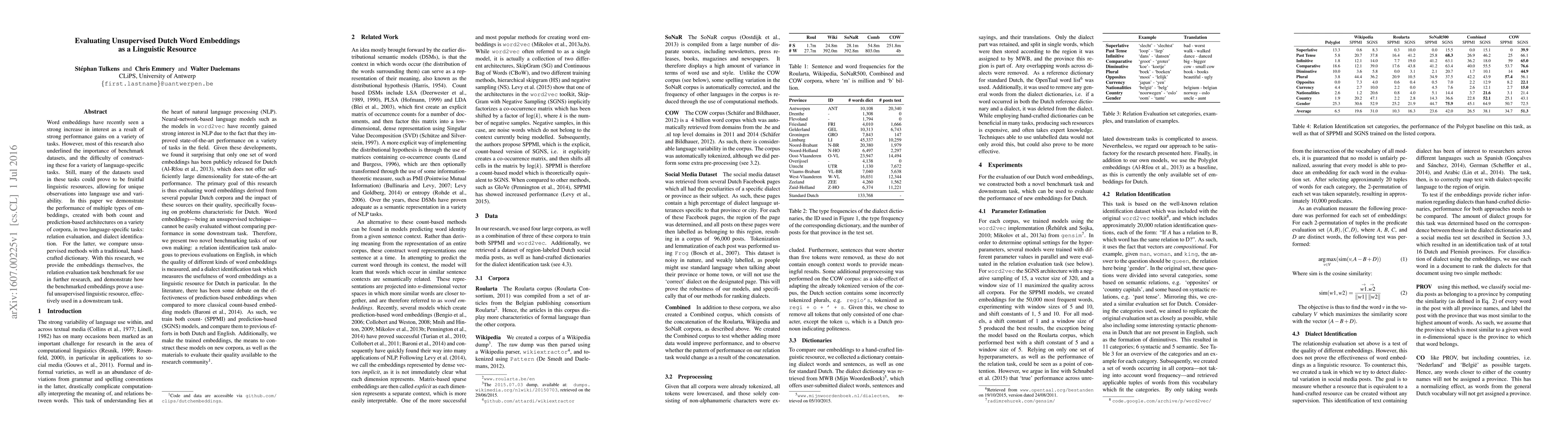 This paper evaluates various unsupervised Dutch word embeddings on relation evaluation and dialect identification tasks, demonstrating their effectiveness as linguistic resources. It provides embeddings and a benchmark task for further research, showcasing their utility in downstream linguistic applications.