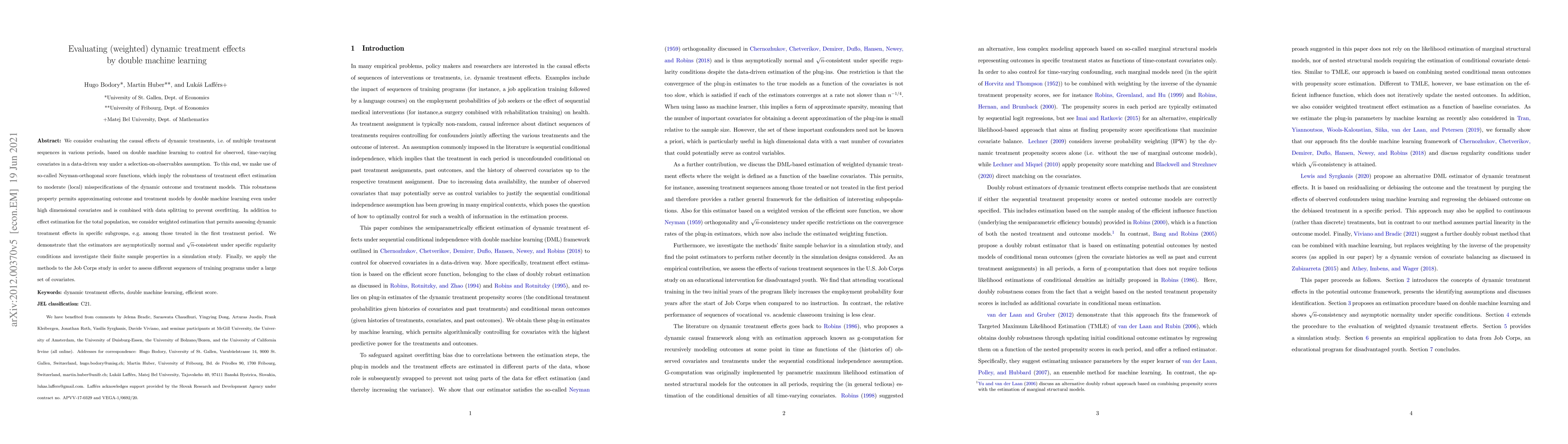 This paper proposes a double machine learning approach to evaluate dynamic treatment effects, leveraging Neyman-orthogonal score functions for robustness against model misspecification. It demonstrates the method's effectiveness through simulations and an application to the Job Corps study, showing the approach's ability to estimate treatment effects in specific subgroups.